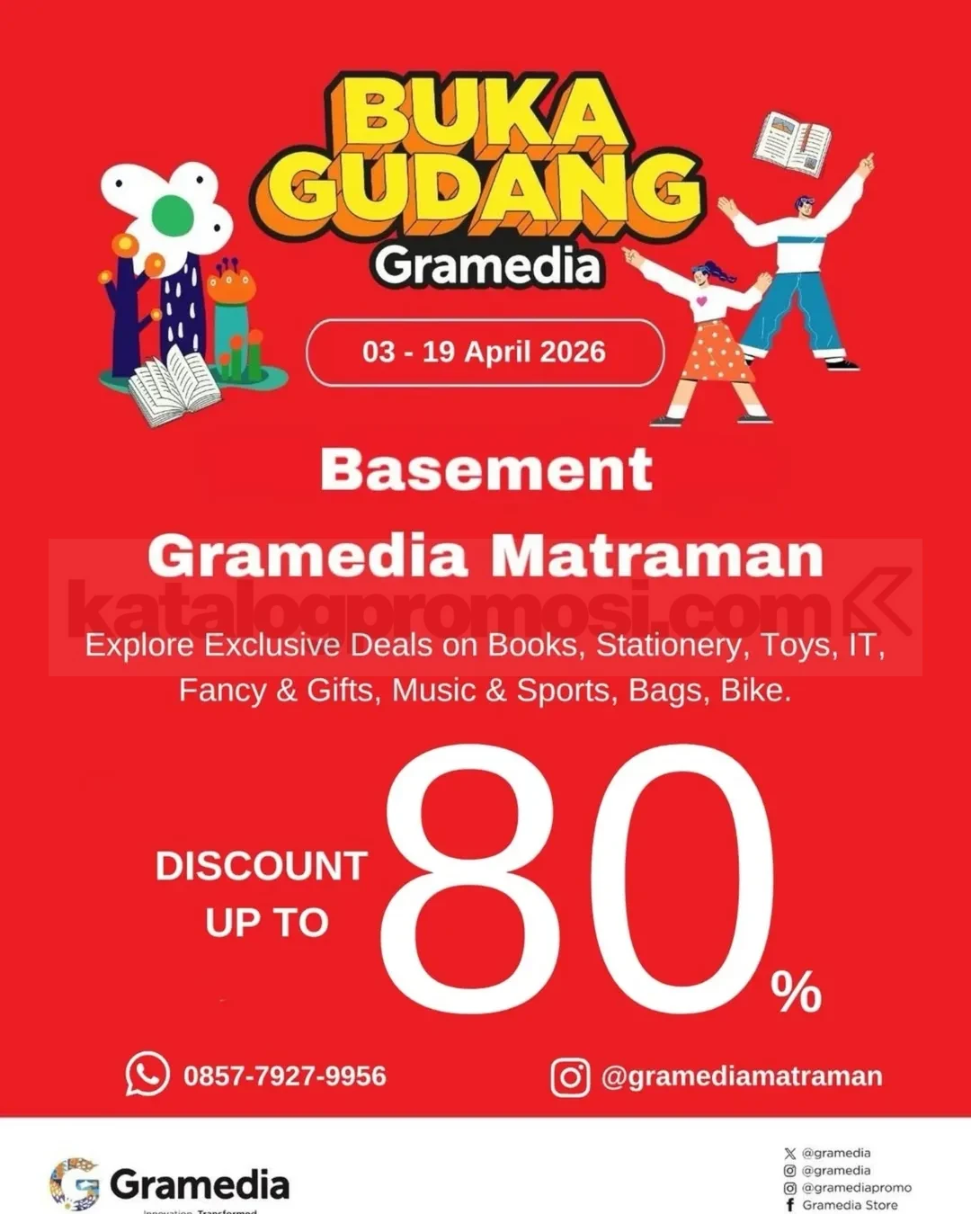 Promo Gramedia Matraman Buka Gudang Diskon 80% periode 3 – 19 April 2026 di Basement Gramedia Matraman untuk berbagai kategori produk.
