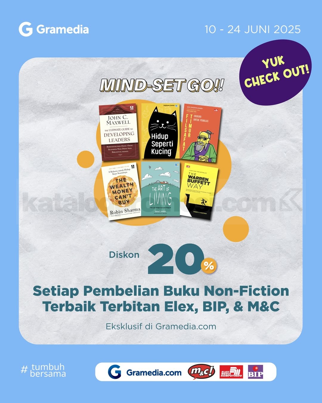 📚✨ Promo Gramedia Mind Set Go lagi jalan nih, buat kamu yang mau naik level bareng buku-buku kece! Beli buku non-fiksi pilihan dari Elex, BIP, dan M&C dapetin diskon 20% yang bikin dompet tetap happy.