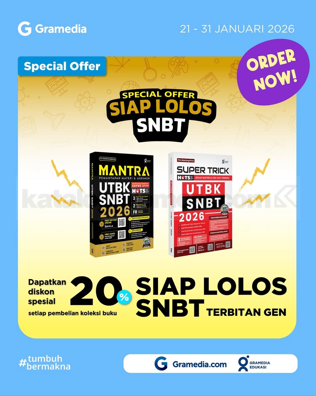 Promo Gramedia Siap Lolos SNBT diskon 20% bantu persiapan SNBT + latihan konsisten, berlaku mulai 21–31 Januari 2026 di Gramedia.com.