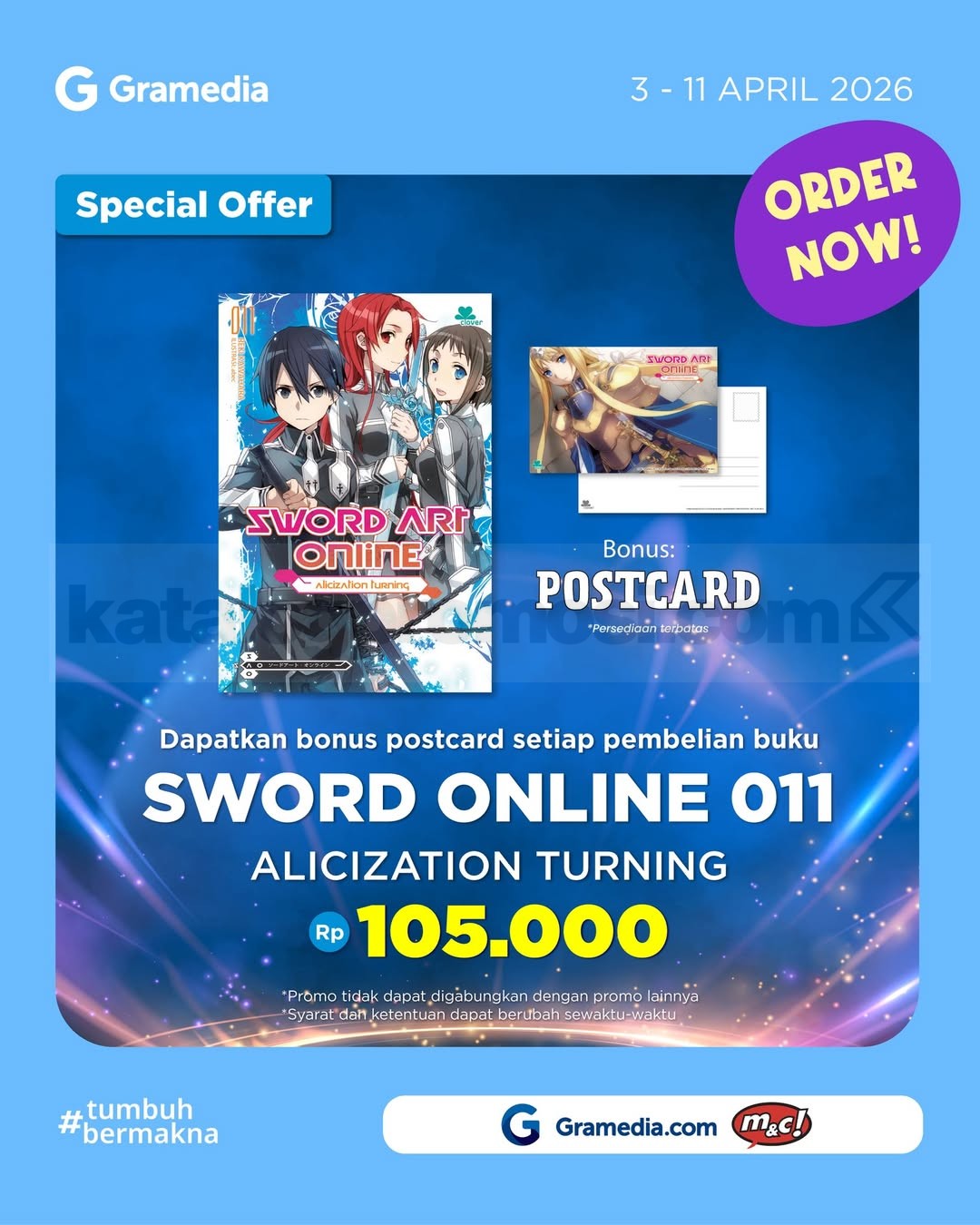 👉 Cek gambar promo Gramedia Sword Art Online 011 Bonus Postcard di bawah ini untuk lihat detail visual dan bonus eksklusifnya!