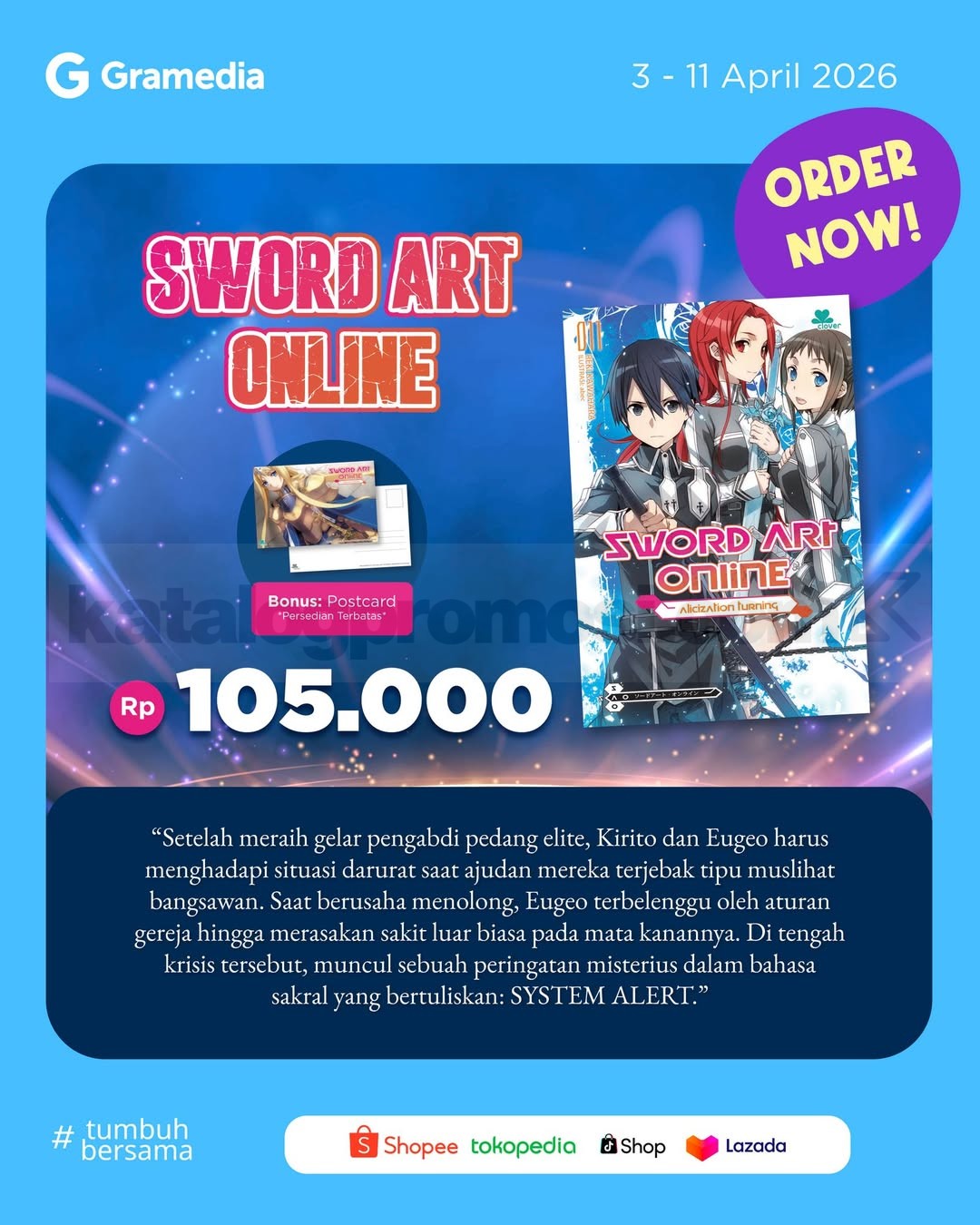 Promo Gramedia Sword Art Online 011 bonus postcard dengan pembelian komik berlaku mulai tanggal 3 April 2026 – 11 April 2026.