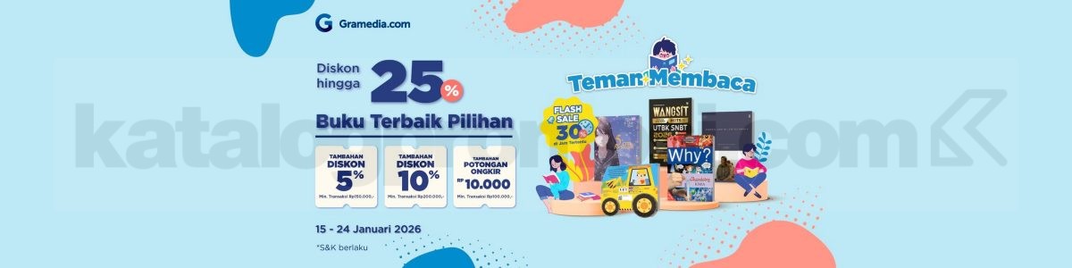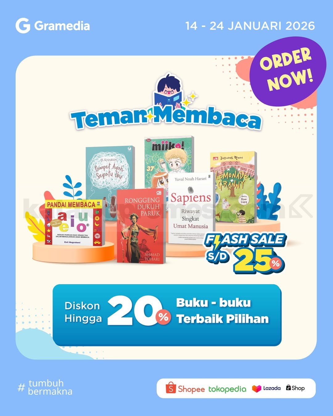 Promo Gramedia Teman Membaca diskon buku hingga 25%, flash sale sampai 30%, tambahan diskon & ongkir berlaku 15 – 24 Januari 2026