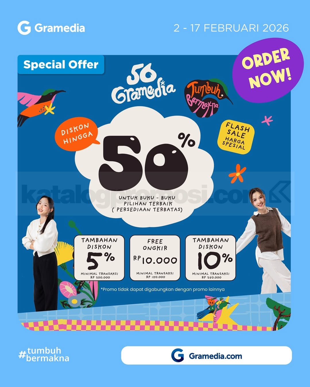 Promo Gramedia diskon buku hingga 50% + tambahan diskon & gratis ongkir, berlaku 2 – 17 Februari 2026 di Gramedia.com