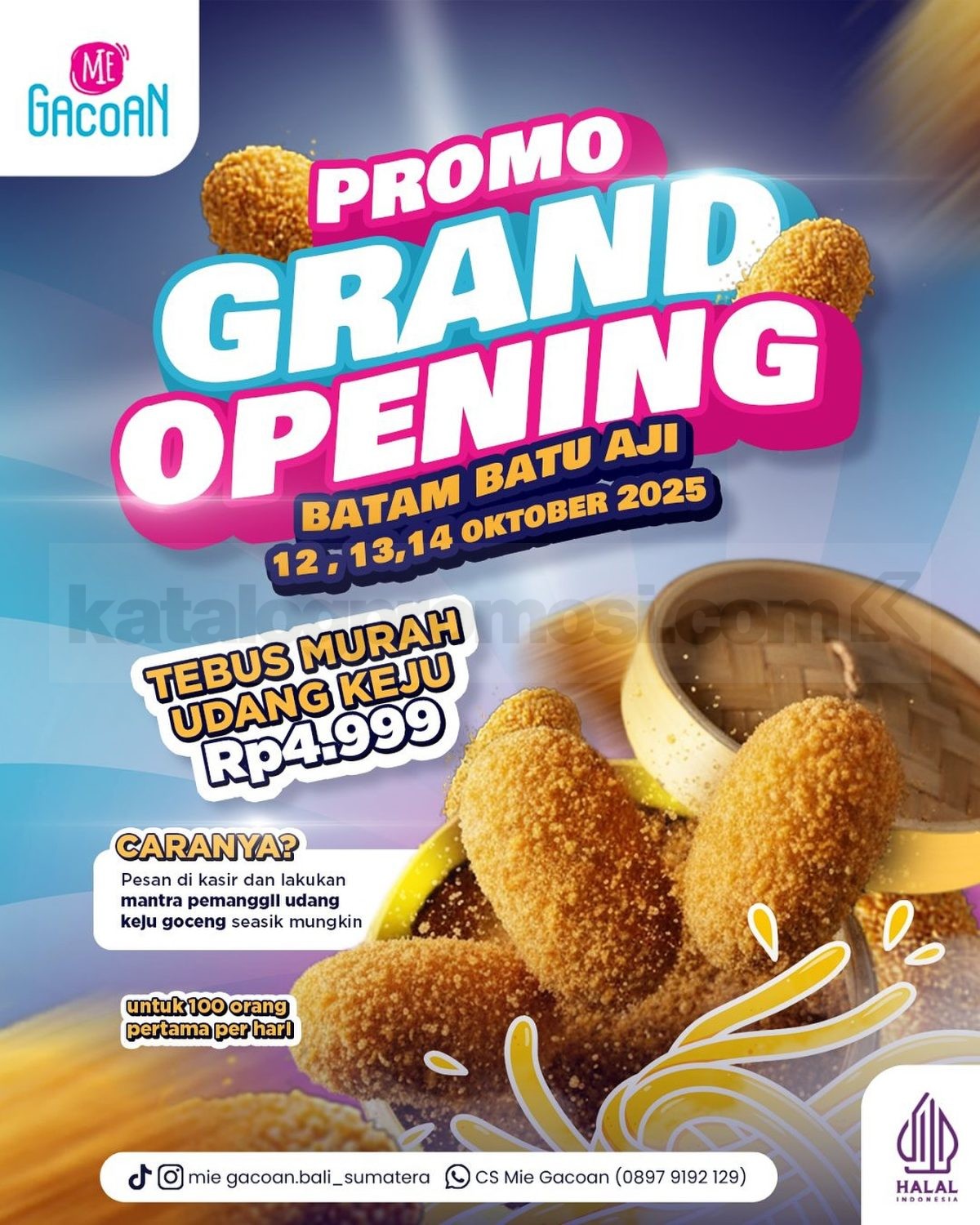Promo Grand Opening Mie Gacoan Batam Batu Aji Udang Keju cuma Rp4.999, Berlaku mulai tanggal 12-14 Oktober 2025.
