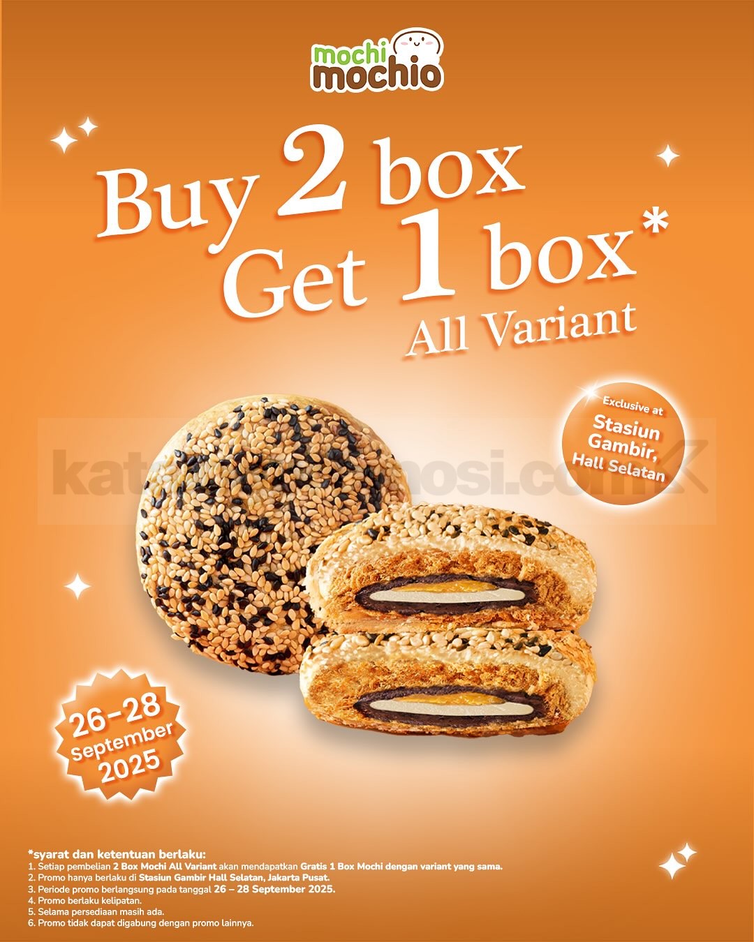 Spesial Promo Grand Opening Mochi Mochio kini hadir di Stasiun Gambir cukup beli 2 Box Mochi Gratis 1 Box Varian yang sama, Berlaku di tanggal 26-28 September 2025.
