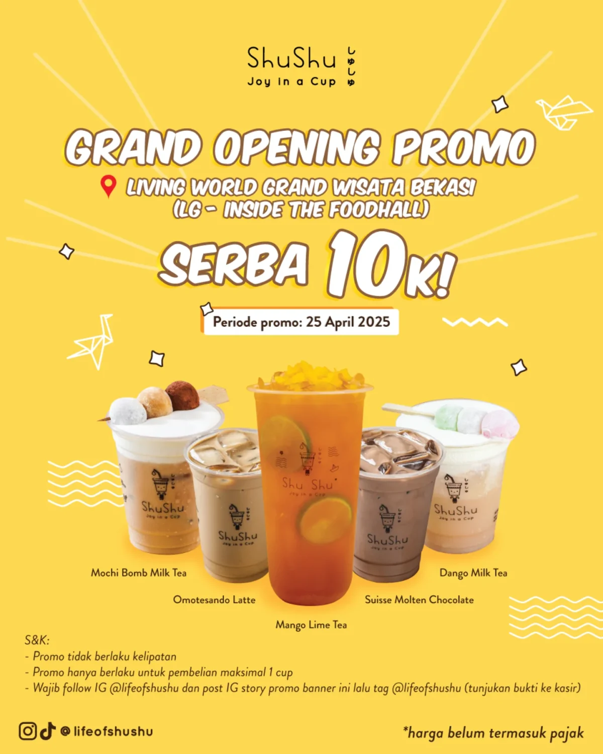 Promo ini berlaku dalam periode terbatas selama liburan akhir tahun dan bisa dinikmati langsung di outlet ShuShu yang berpartisipasi. Dengan banyaknya pilihan rasa, Joyful Package cocok buat jadi teman nongkrong, quality time, atau sekadar treat kecil di tengah padatnya aktivitas liburan ππ₯€