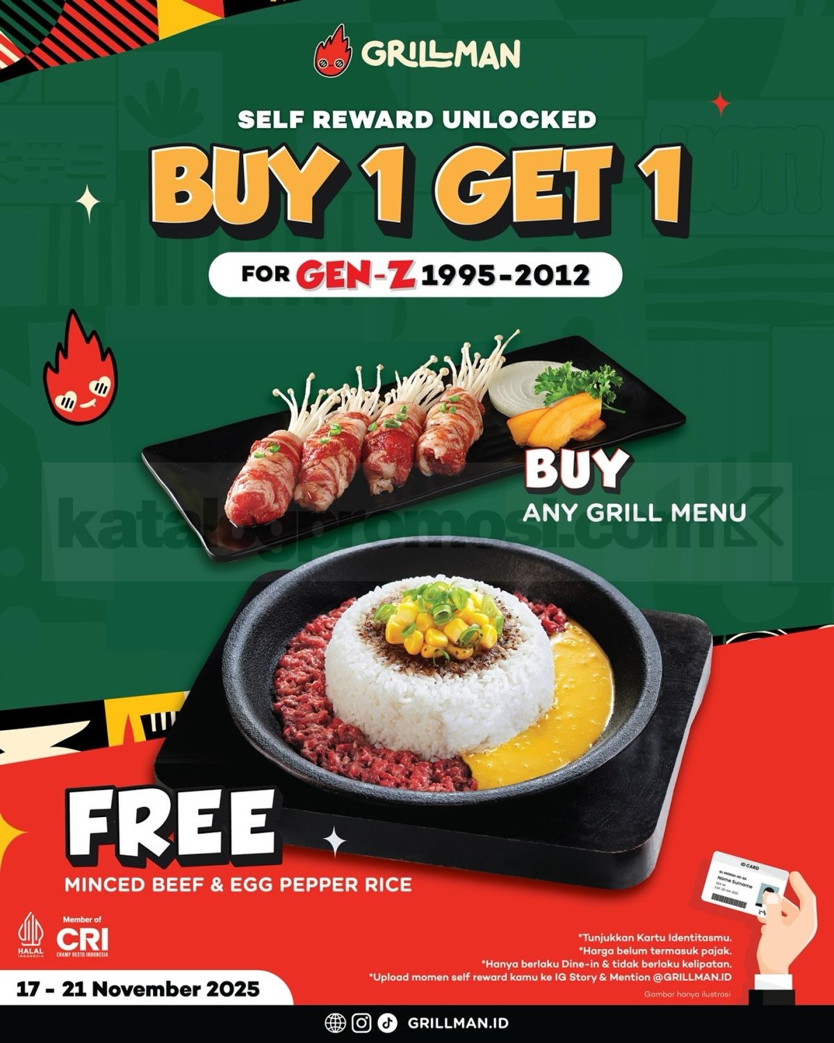Promo Grillman Buy 1 Get 1 untuk Gen Z dengan bonus Minced Beef & Egg Pepper Rice berlaku 17โ€“21 November 2025 di lokasi tertentu.