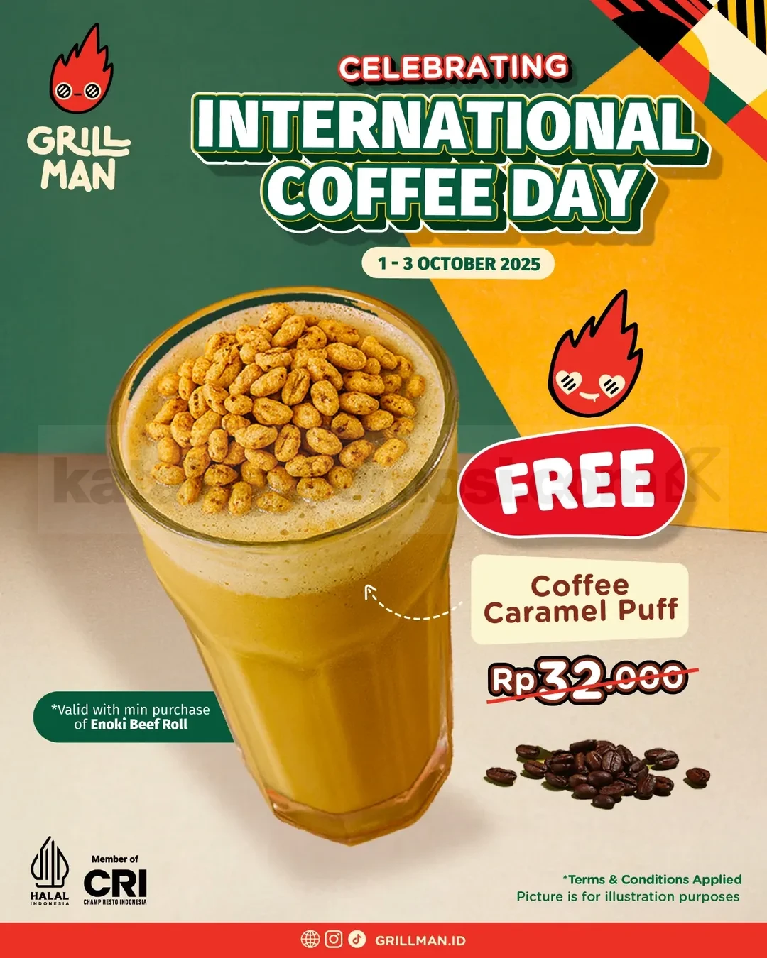Promo Grillman International Coffee Day! Gratis Coffee Caramel Puff setiap pembelian Enoki Beef Roll dari tanggal 1-3 Oktober 2025