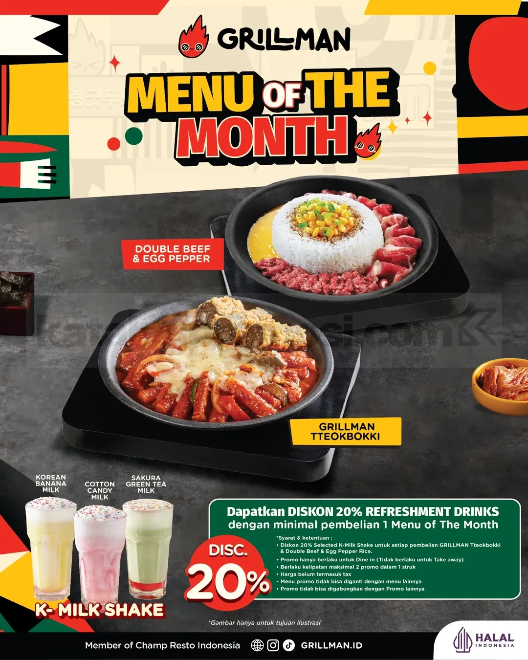 Promo Grillman Menu of the Month! Nikmati Grillman Tteokbokki & Double Beef Pepper Rice plus diskon 20% K-Milk Shake s.d 31 Agustus 2025.