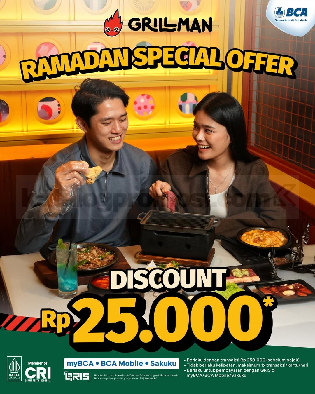 Promo GRILLMAN Spesial Ramadan Diskon Rp. 25.000 untuk transaksi min. Rp. 250.000 via QRIS myBCA, BCA Mobile, Sakuku berlaku hingga 14 Maret 2026 di seluruh outlet.