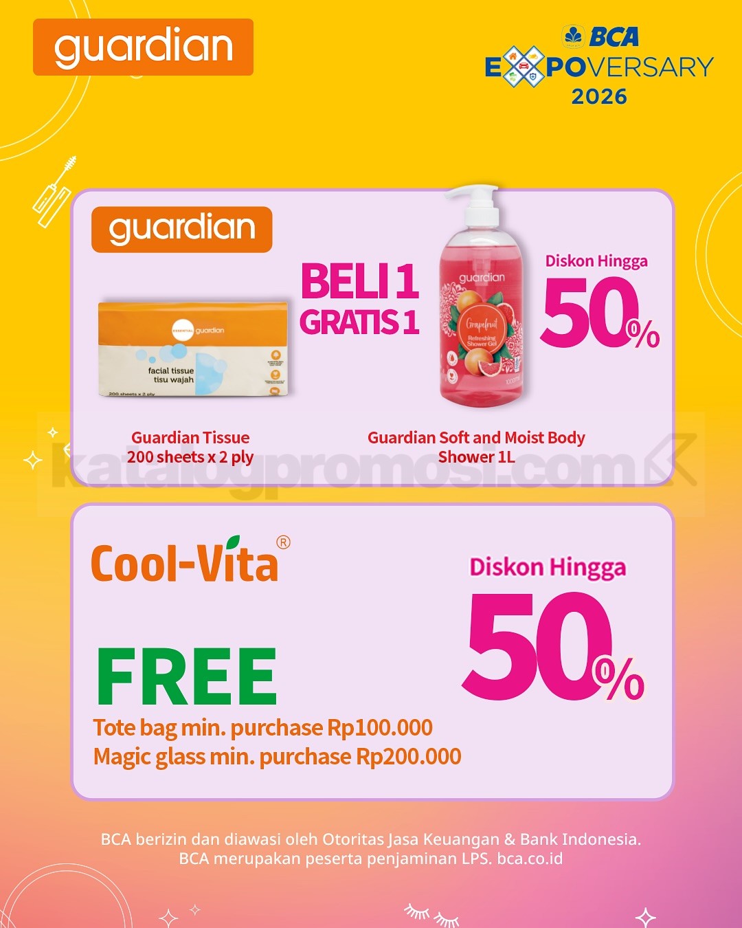 Nikmati kesempatan belanja hemat sambil menjaga kesehatan dan kecantikan Anda! Jangan lewatkan promo Guardian BCA Expoversary 2026, datang langsung ke ICE BSD Hall 3, manfaatkan diskon hingga 50%, voucher Rp. 25.000, dan hadiah seru lainnya. 💓✨