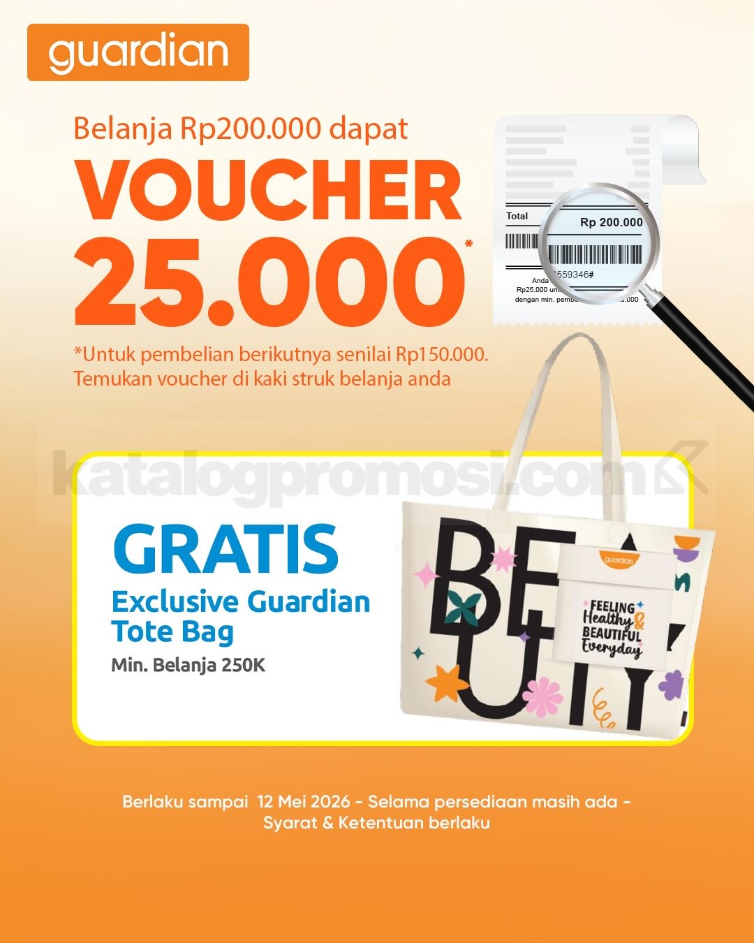 Promo Guardian Cibubur Voucher Rp. 25.000 & Gratis Tote Bag dapatkan voucher belanja Rp. 25.000 dan tote bag gratis dengan belanja minimal Rp. 200.000–Rp. 250.000 berlaku 13 April 2026 – 12 Mei 2026 di Ruko Jambore Cibubur.