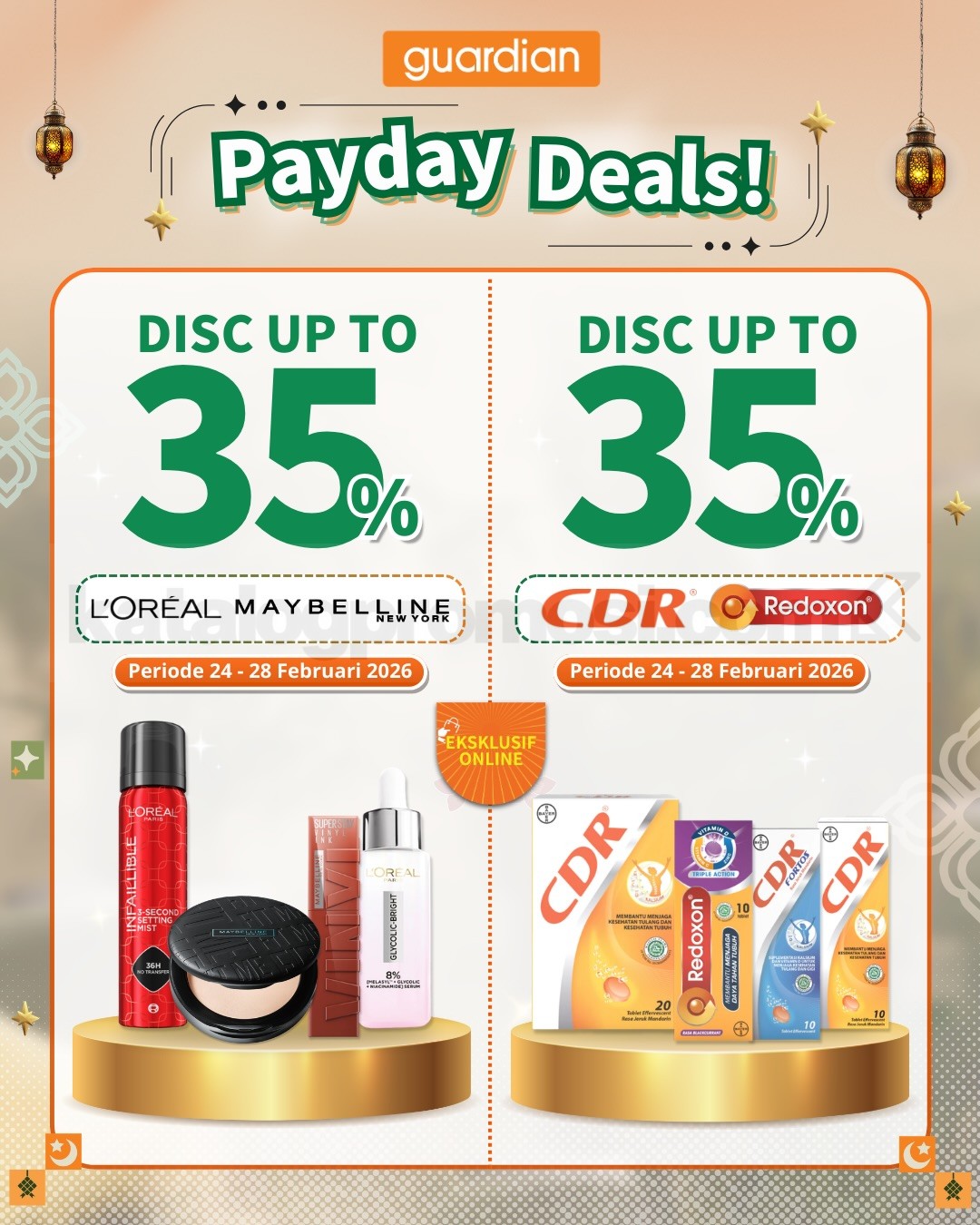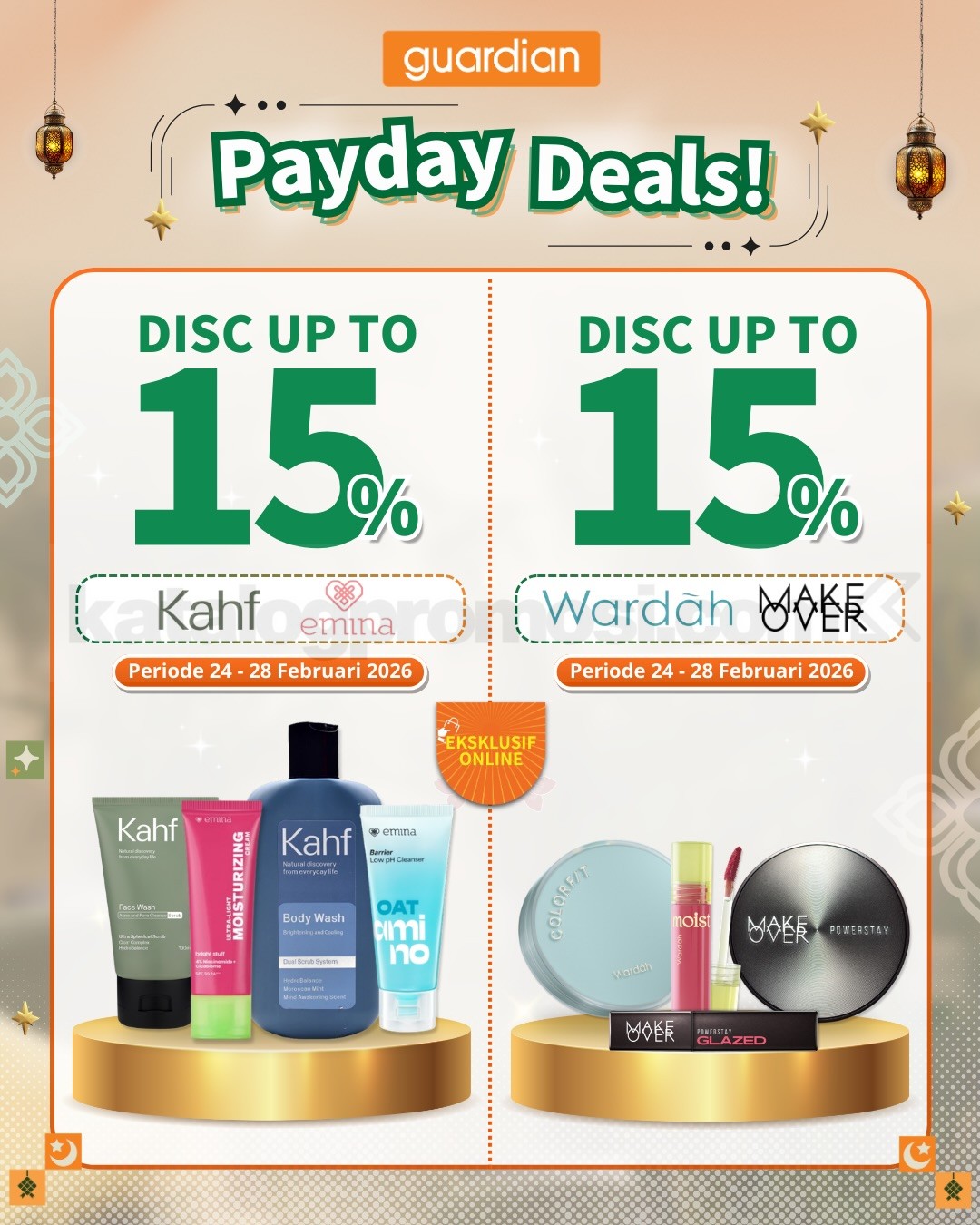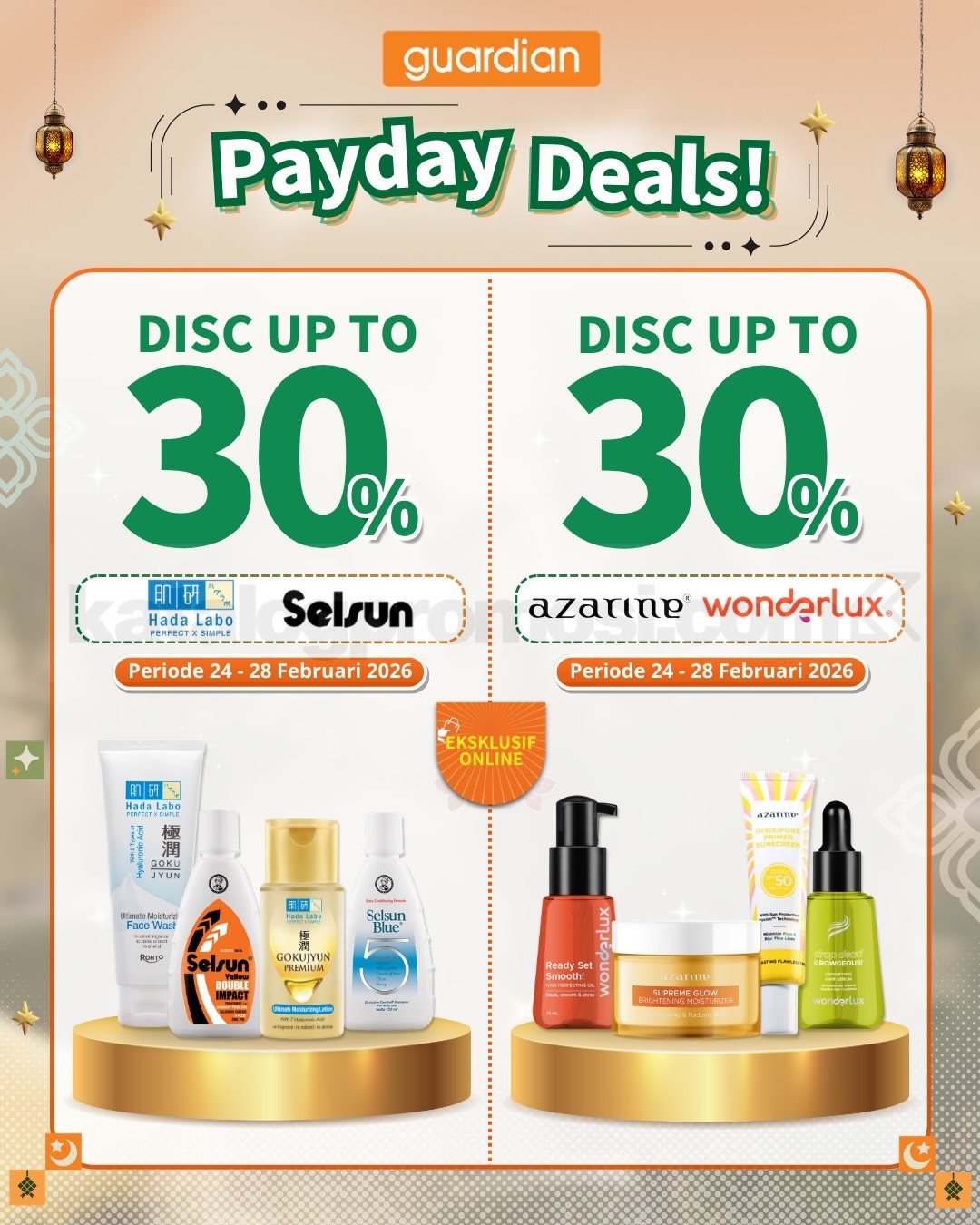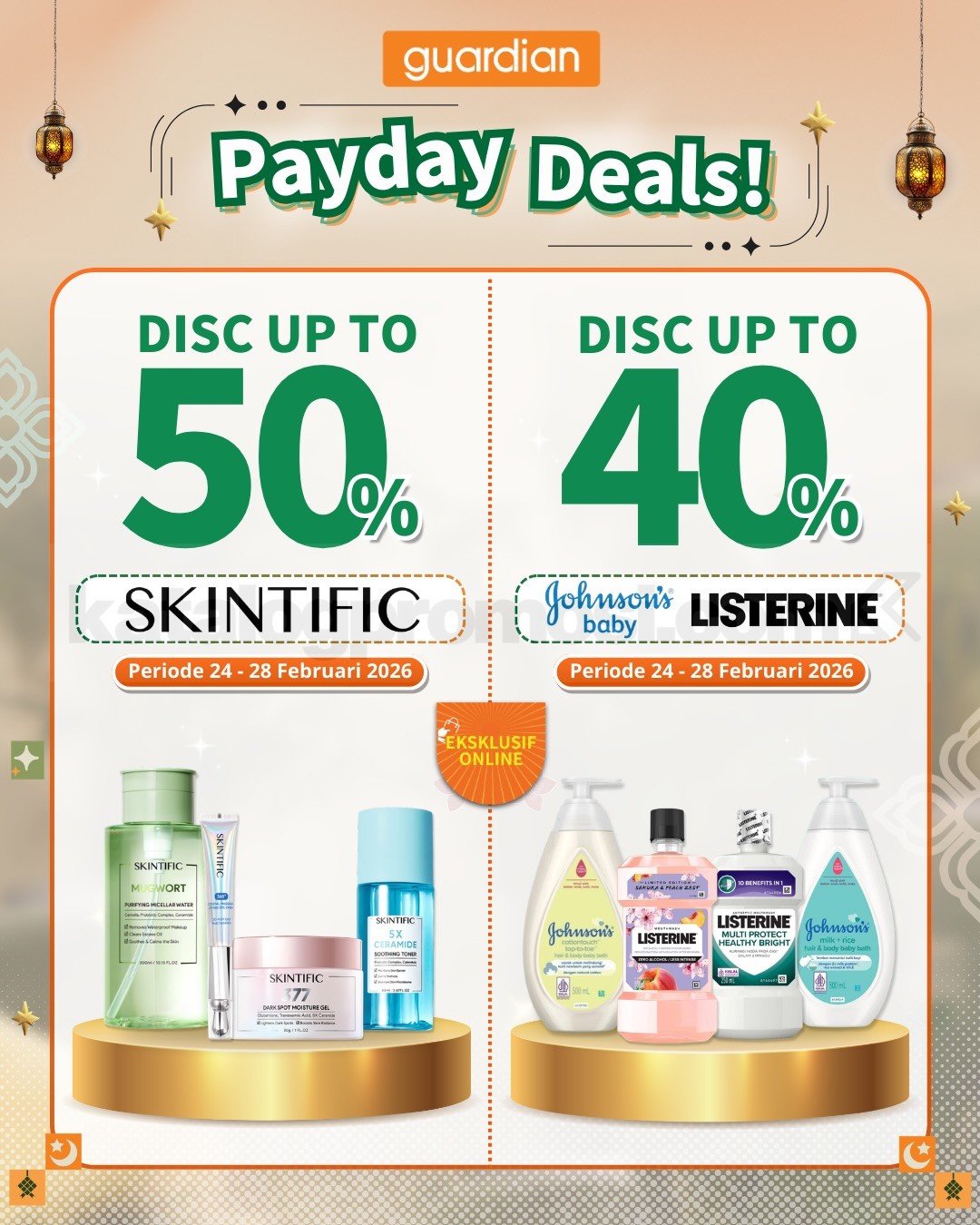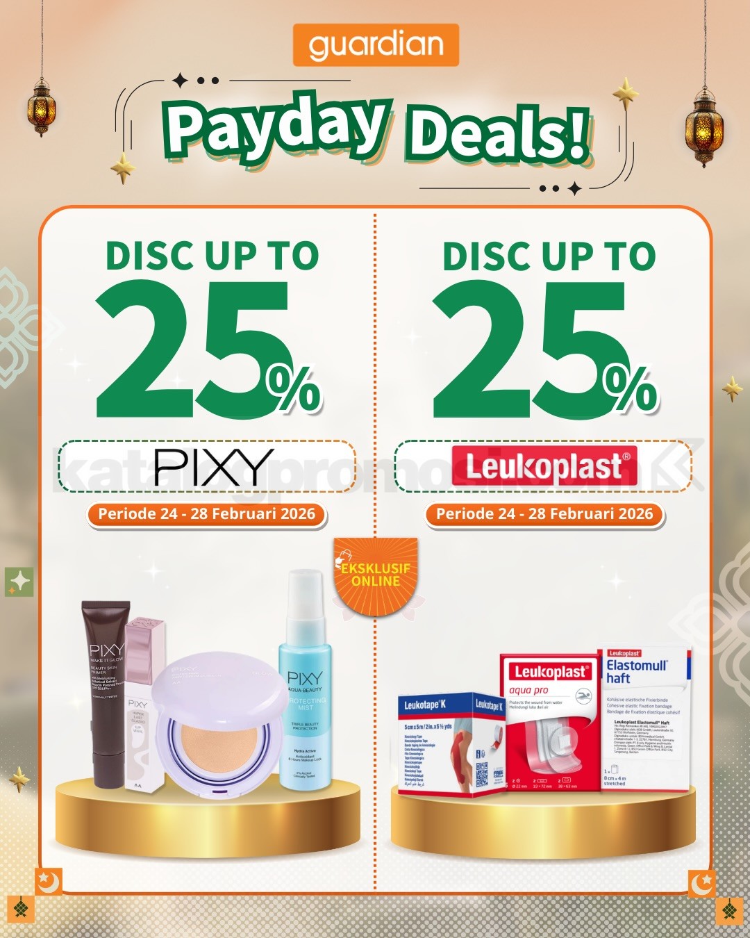 Promo Guardian Payday Deals Diskon hingga 50% + ekstra voucher & gratis hadiah berlaku mulai tanggal 24 Februari 2026 – 28 Februari 2026 melalui channel resmi Guardian.