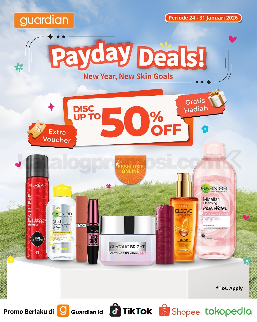 Promo Guardian Payday Deals Skincare Makeup Diskon 50% extra voucher dan free gift, belanja online produk favorit berlaku mulai tanggal 24 Januari 2026 – 31 Januari 2026.