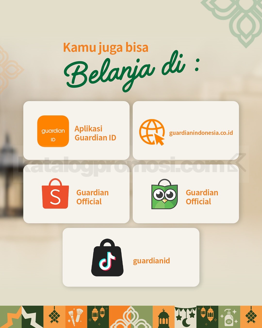 Belanja bisa dilakukan di Guardian terdekat atau secara online melalui Shopee/Tokopedia Guardian Official, TikTok Shop (@guardianid), Aplikasi Guardian ID, dan situs resmi guardianindonesia.co.id.