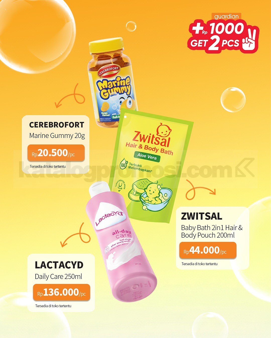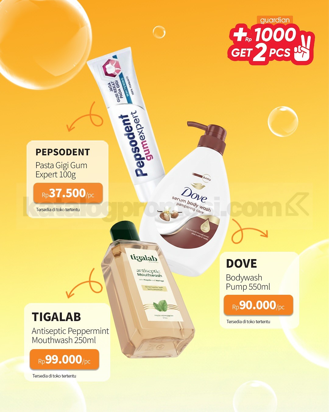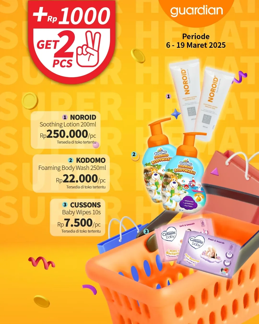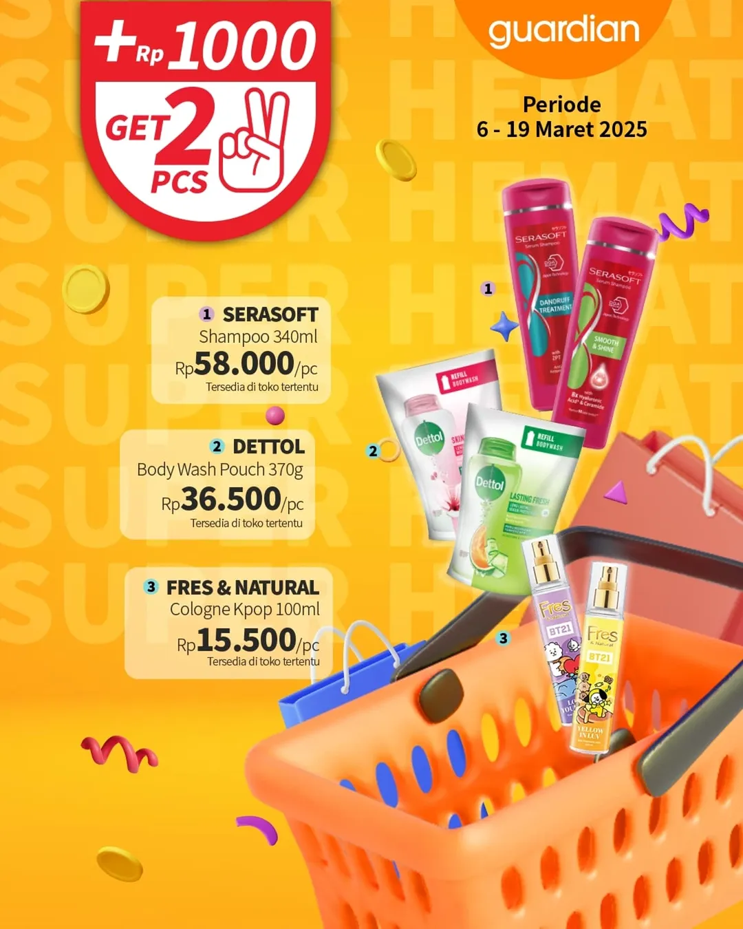 Semua produk berlaku promo +Rp1.000 dapat 2 pcs dan berlaku di semua gerai Guardian, dengan harga berbeda untuk Bali, Kendari, dan Kupang.