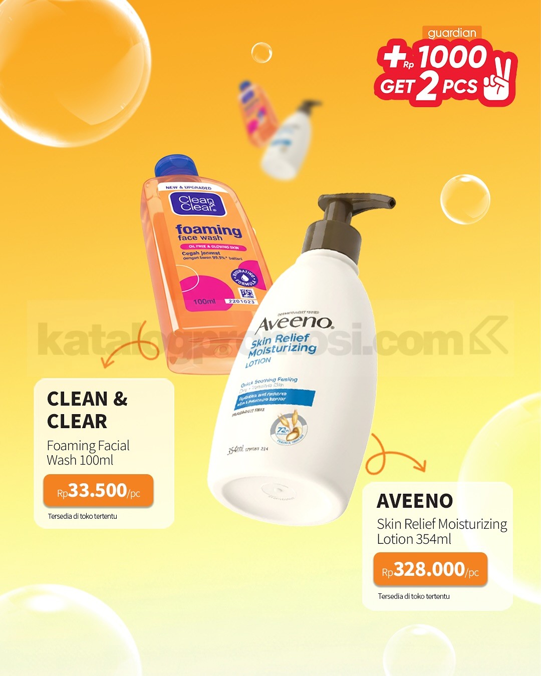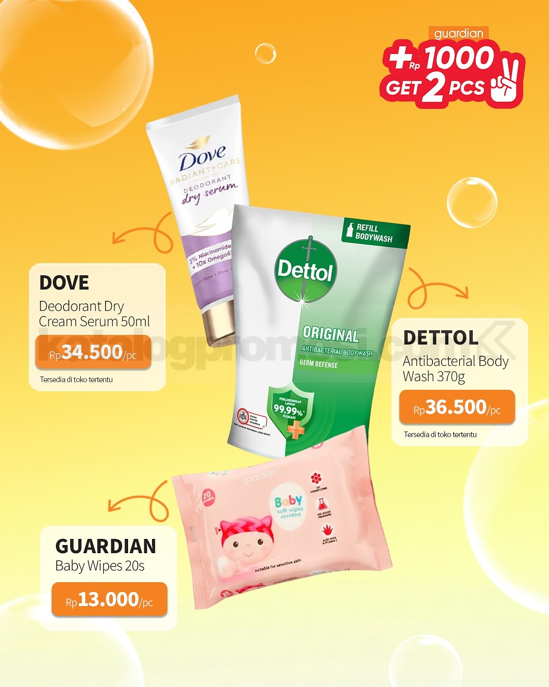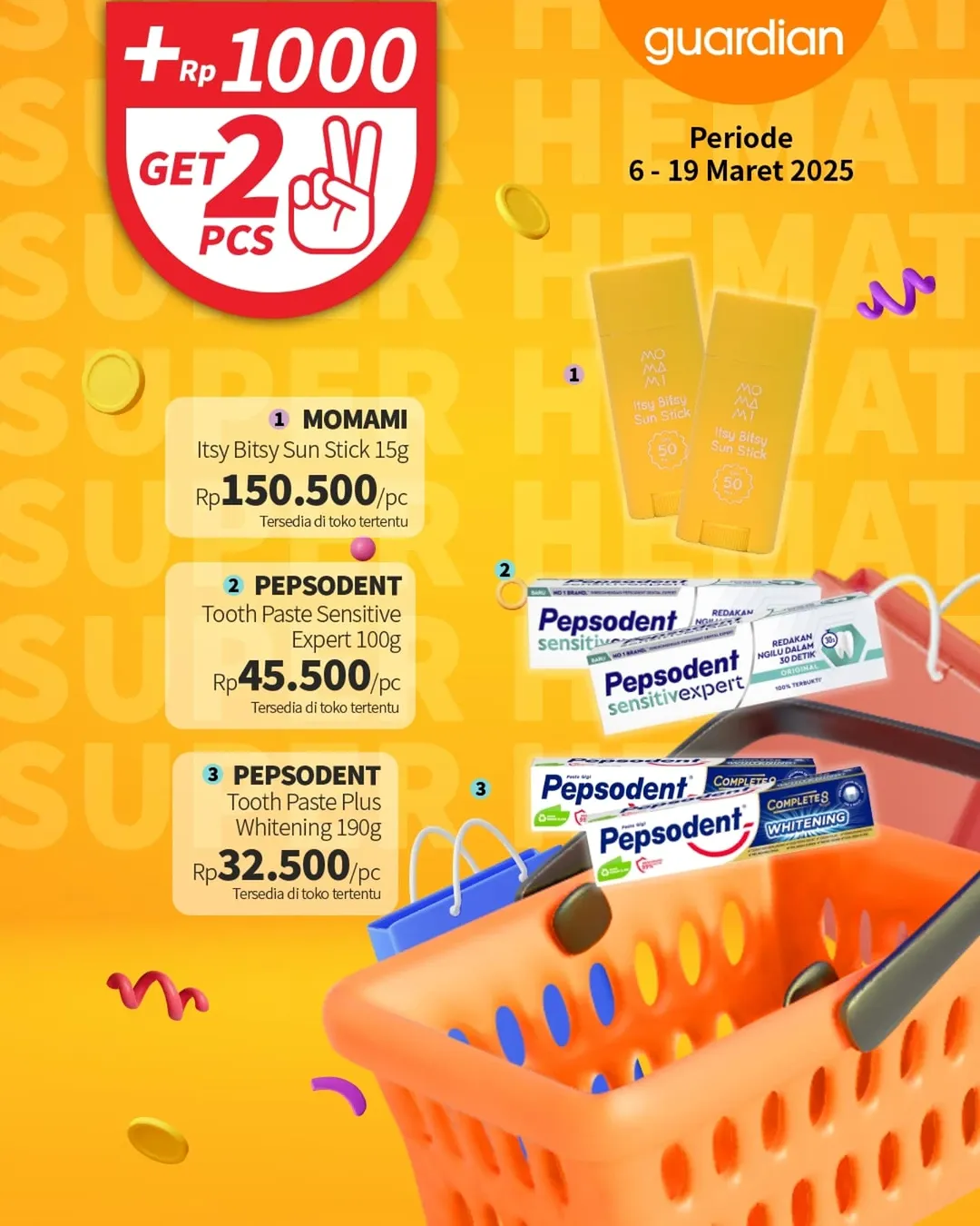 Semua produk berlaku promo +Rp1.000 dapat 2 pcs dan berlaku di semua gerai Guardian, dengan harga berbeda untuk Bali, Kendari, dan Kupang.