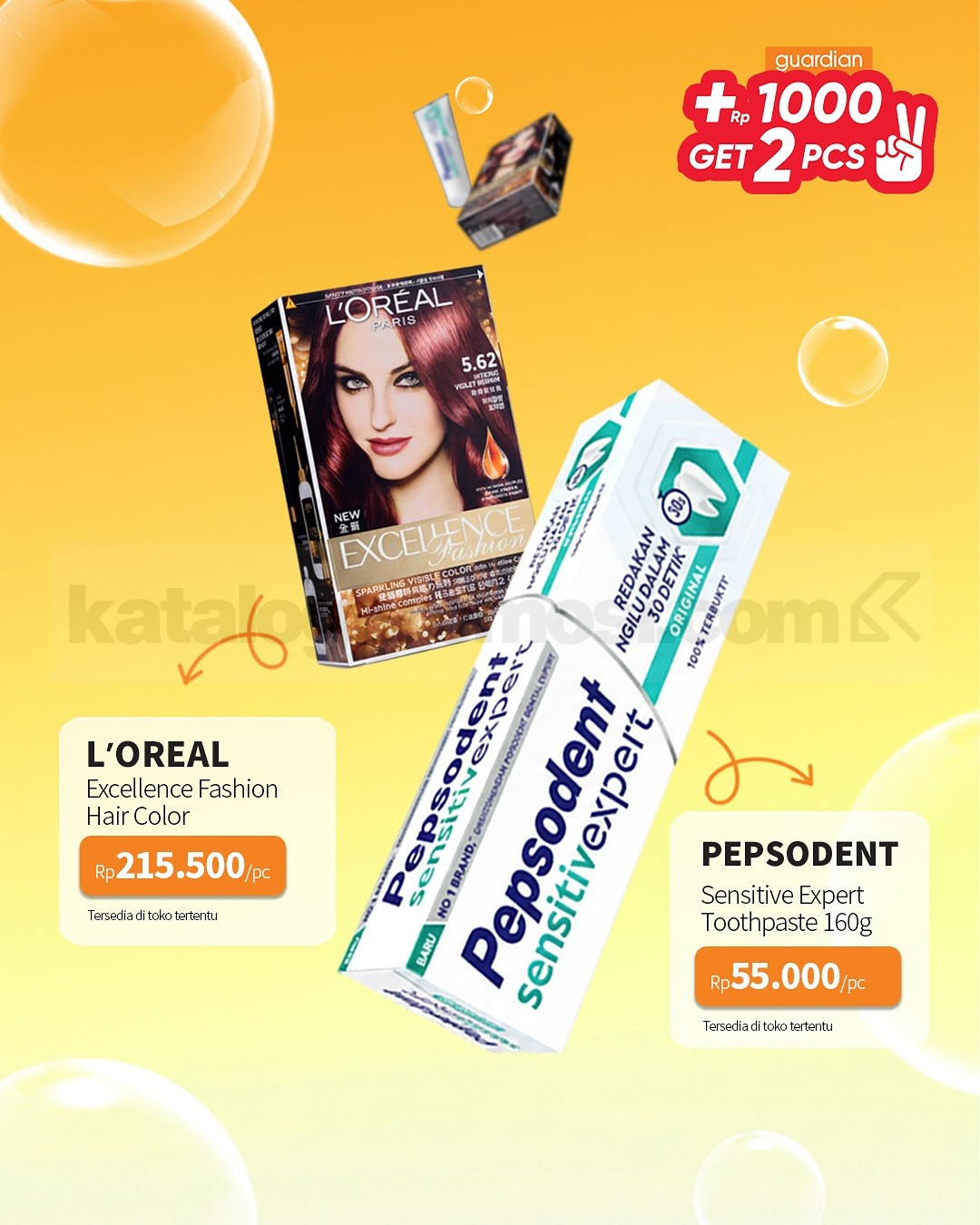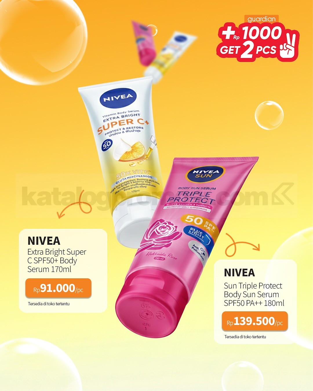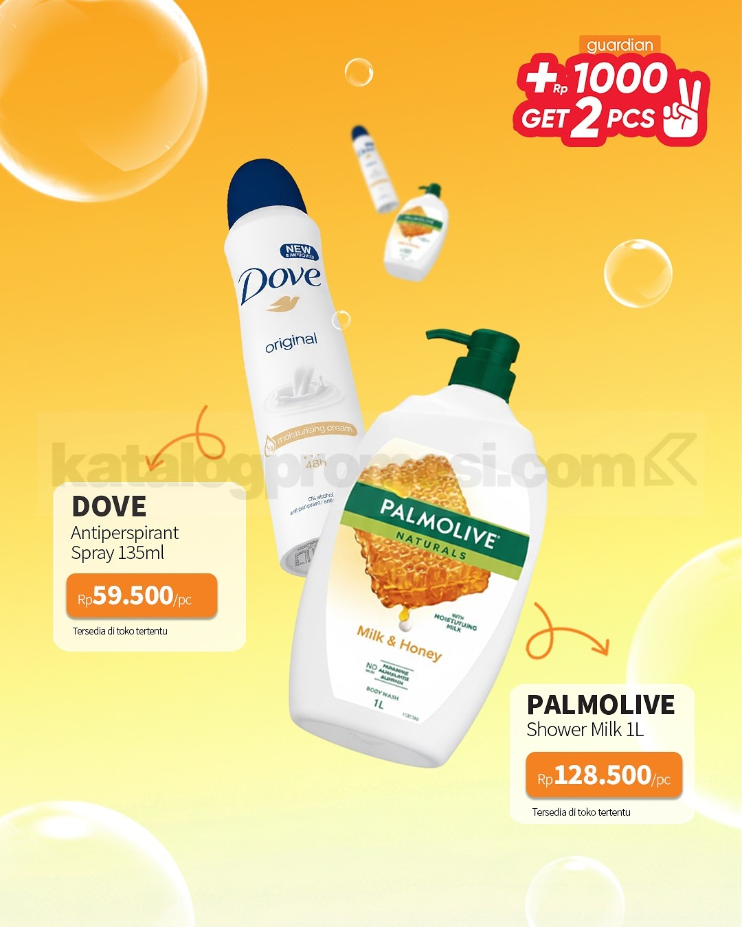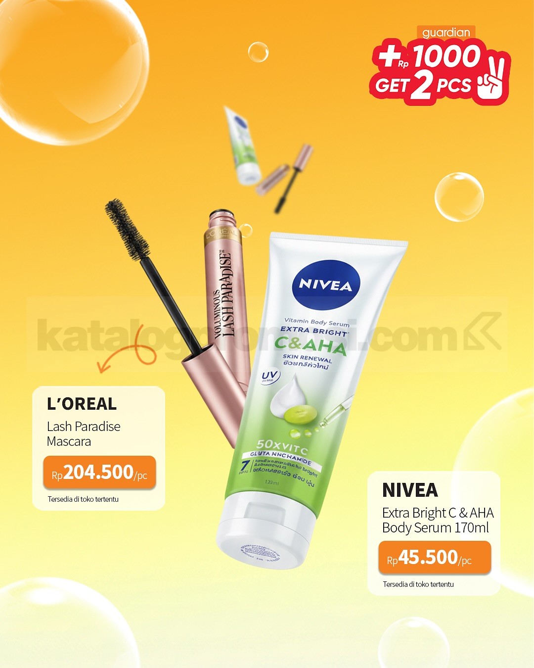 Semua produk berlaku promo +Rp1.000 dapat 2 pcs dan berlaku di semua gerai Guardian, dengan harga berbeda untuk Bali, Kendari, dan Kupang.