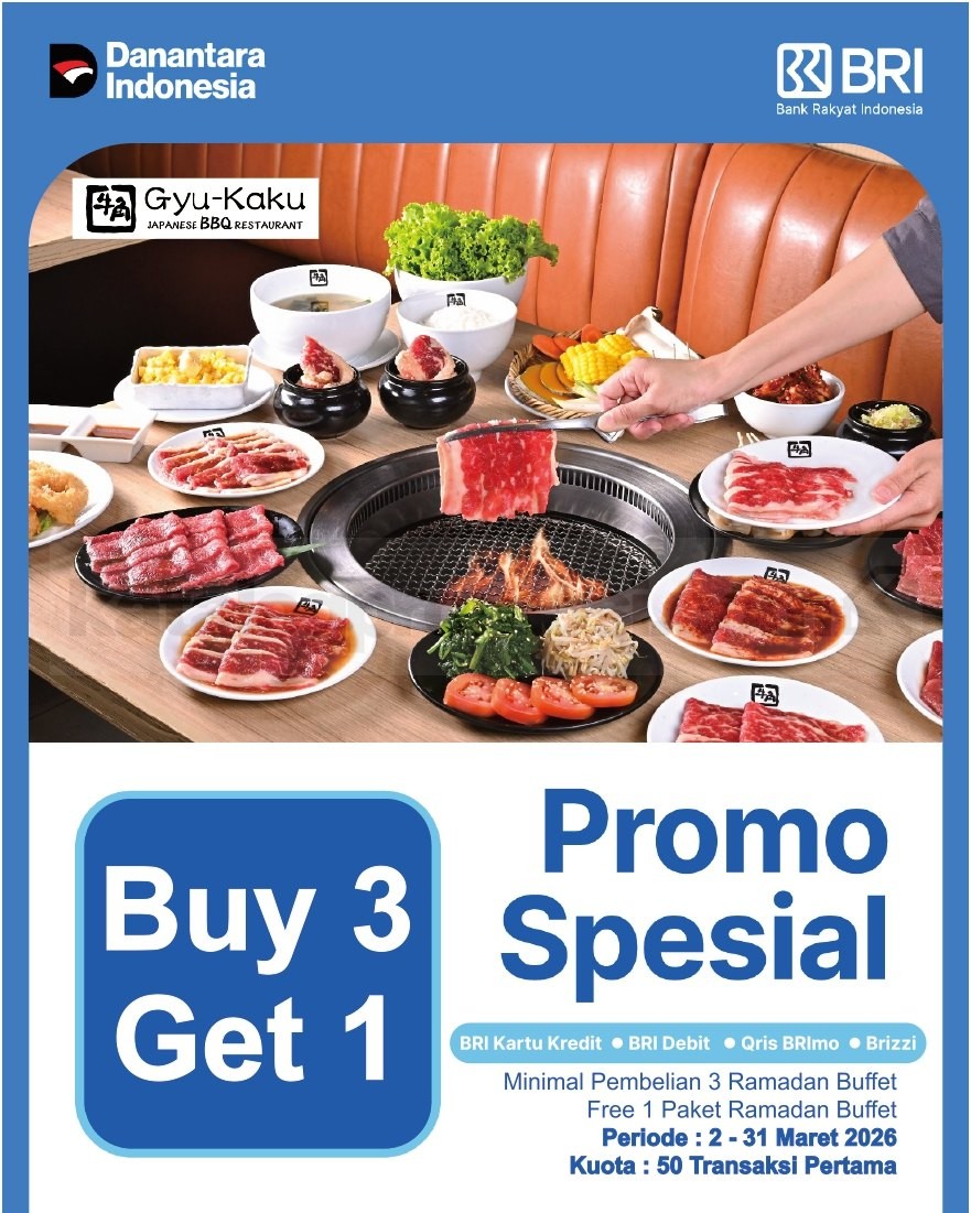 Manfaatkan Promo Gyu-Kaku BRI Buy 3 Get 1 Ramadan Buffet untuk bikin momen buka puasa bareng jadi lebih hemat dan tetap puas grill sepuasnya.