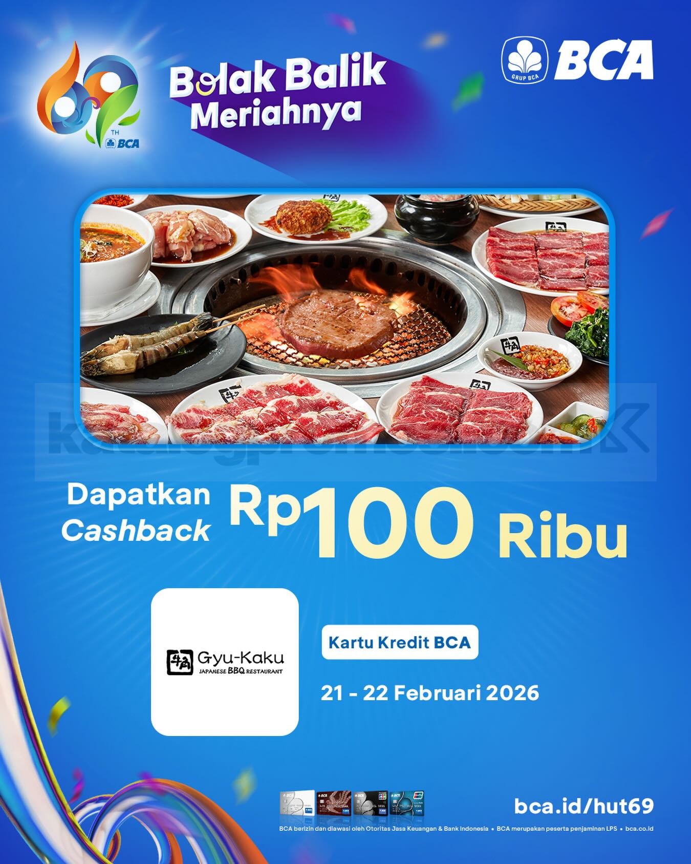 Dalam rangka HUT BCA, tersedia cashback Rp. 100.000 untuk transaksi minimal Rp. 600.000 sebelum pajak dan servis di Gyu-Kaku pada 21 – 22 Februari 2026.