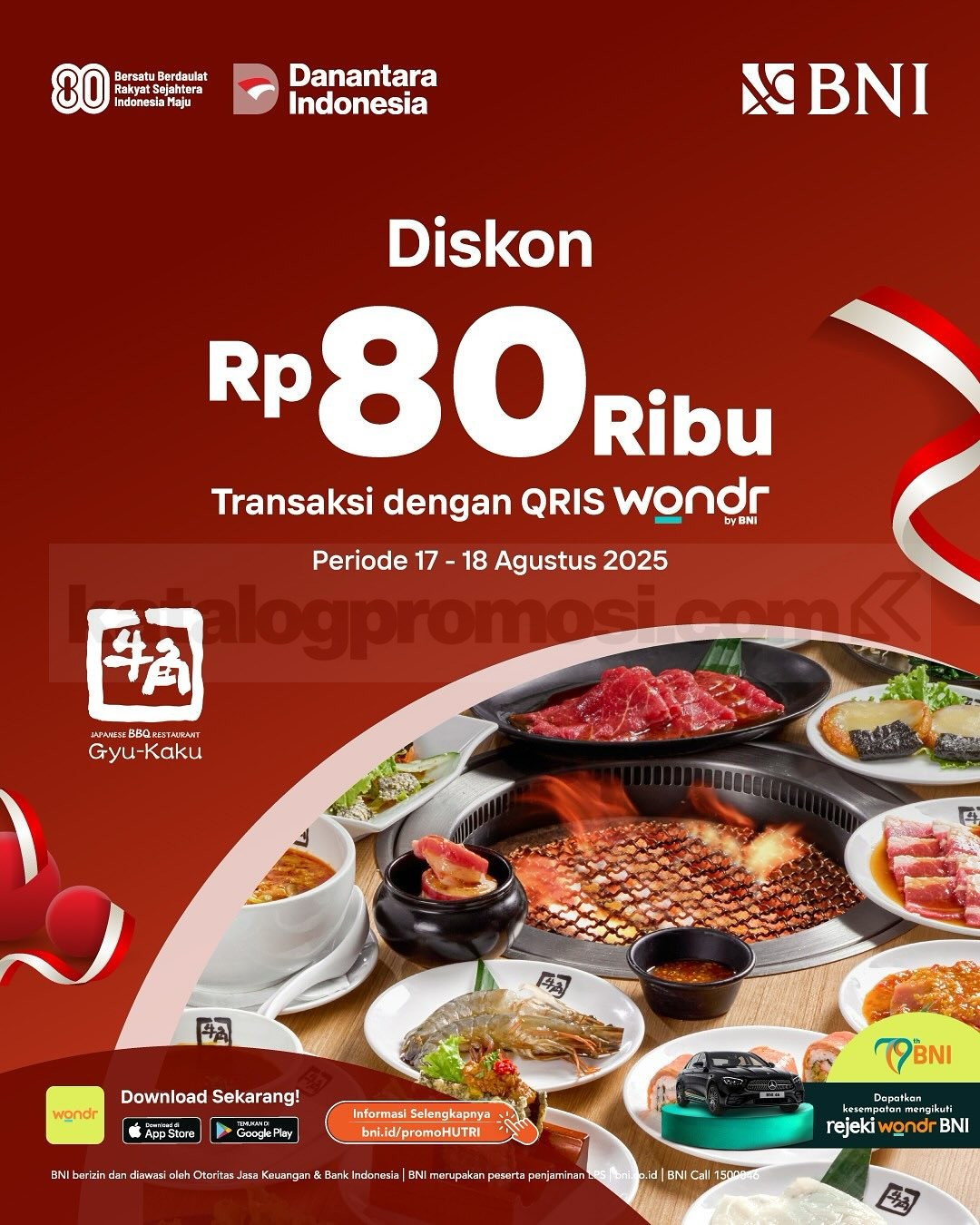 Promo Gyu-Kaku Merdeka dengan QRIS Wondr BNI diskon Rp80.000, dessert Milk Pudding atau Ice Cream Rp8.000++, dan buffet menu baru diskon sampai Rp50.000 berlaku Agustus 2025.