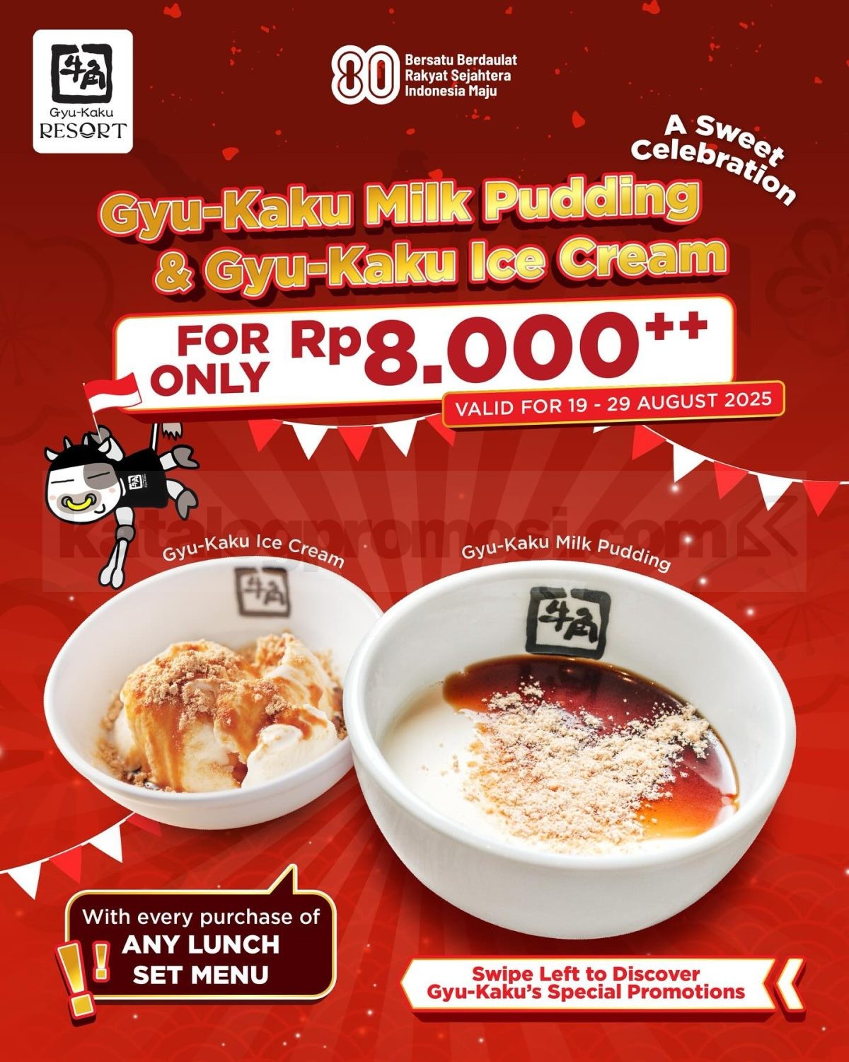 Kalau kamu datang setelahnya, jangan sedih. Mulai tanggal 19β29 Agustus 2025 ada harga spesial Rp8.000++ buat dessert favorit Gyu-Kaku, yaitu Milk Pudding atau Ice Cream. Promo ini berlaku setiap pembelian Lunch Set Menu, dengan ketentuan 1 Lunch Set hanya bisa pesan 1 porsi dessert harga spesial. Berlaku SeninβJumat dari jam 10.00 sampai 16.00, tidak termasuk hari libur nasional dan cuti bersama.