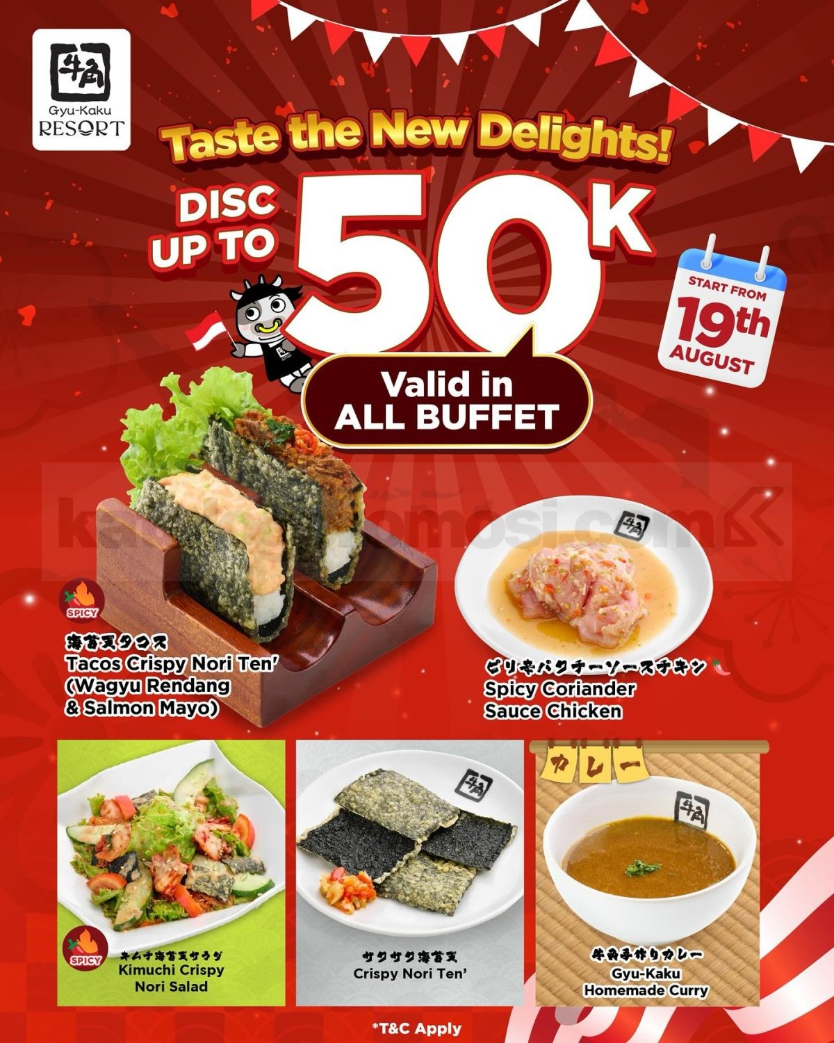 Selain itu, buat kamu yang suka eksplor menu baru, ada tambahan diskon hingga Rp50.000 buat setiap pembelian Buffet mulai tanggal 19 Agustus 2025. Diskonnya dihitung per menu baru, jadi setiap coba 5 menu baru kamu bisa hemat Rp10.000 per menu, totalnya bisa sampai Rp50.000. Menu baru yang bisa dicoba di antaranya Gyu-Kaku Homemade Curry, Kimuchi with Crispy Nori Salad, Tacos Crispy Nori Ten (Wagyu Rendang & Salmon Mayo), Crispy Nori Ten, dan Spicy Coriander Sauce Chicken.