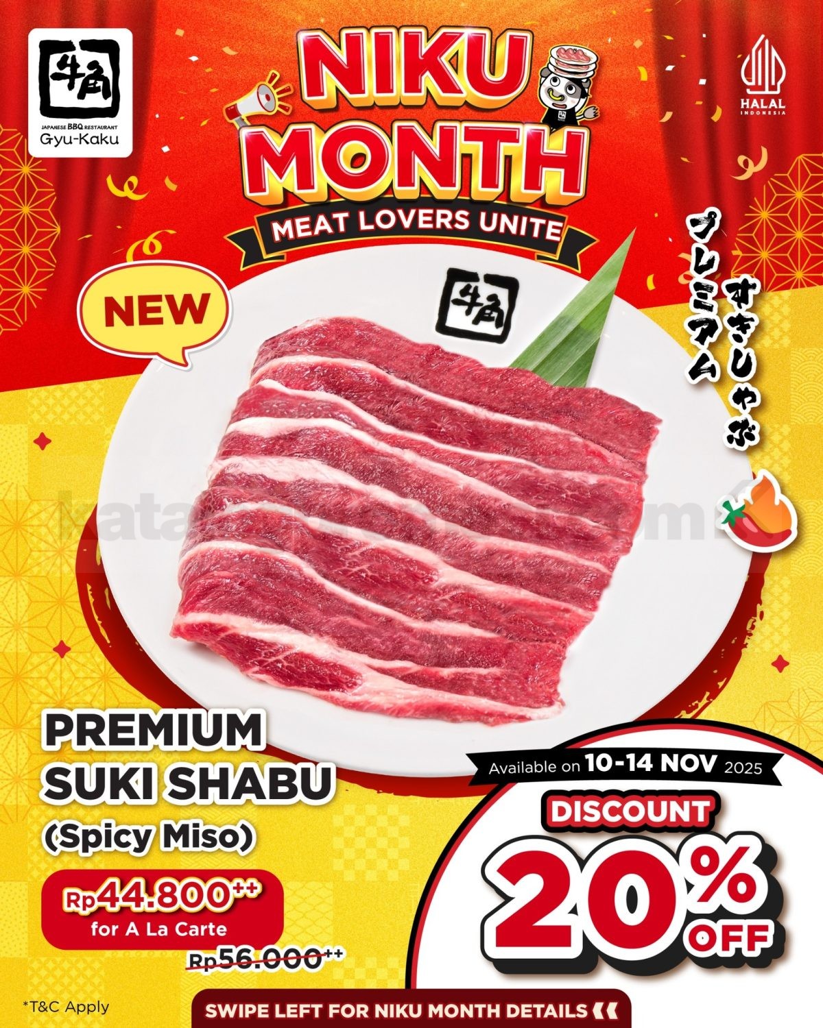 Gyu-Kaku Lovers, dalam rangka NIKU MONTH, kalian bisa nikmati berbagai spesial promo di Gyu-Kaku! Mulai 10 November 2025, ada dua penawaran paling dekat yang sayang dilewatkan: diskon 20% untuk Premium Suki Shabu dan diskon 20% untuk Prime Gyu-Kaku Karubi.