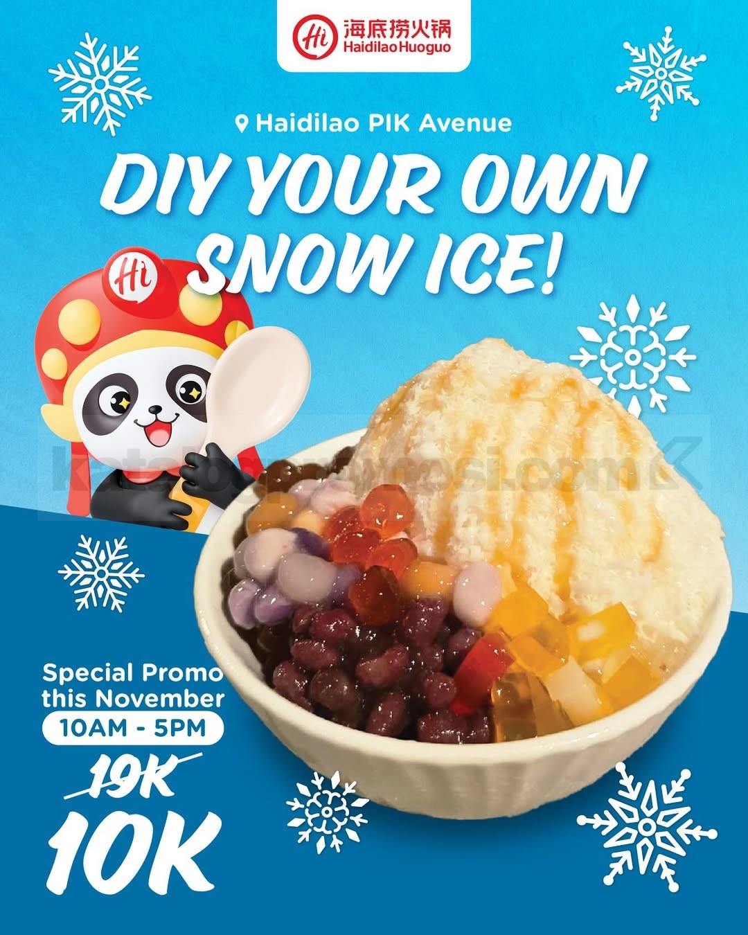 Promo Haidilao DIY Snow Ice mulai Rp. 10.000, buat kreasi topping sendiri, berlaku setiap hari 10.00–17.00 WIB sampai akhir November di PIK Avenue