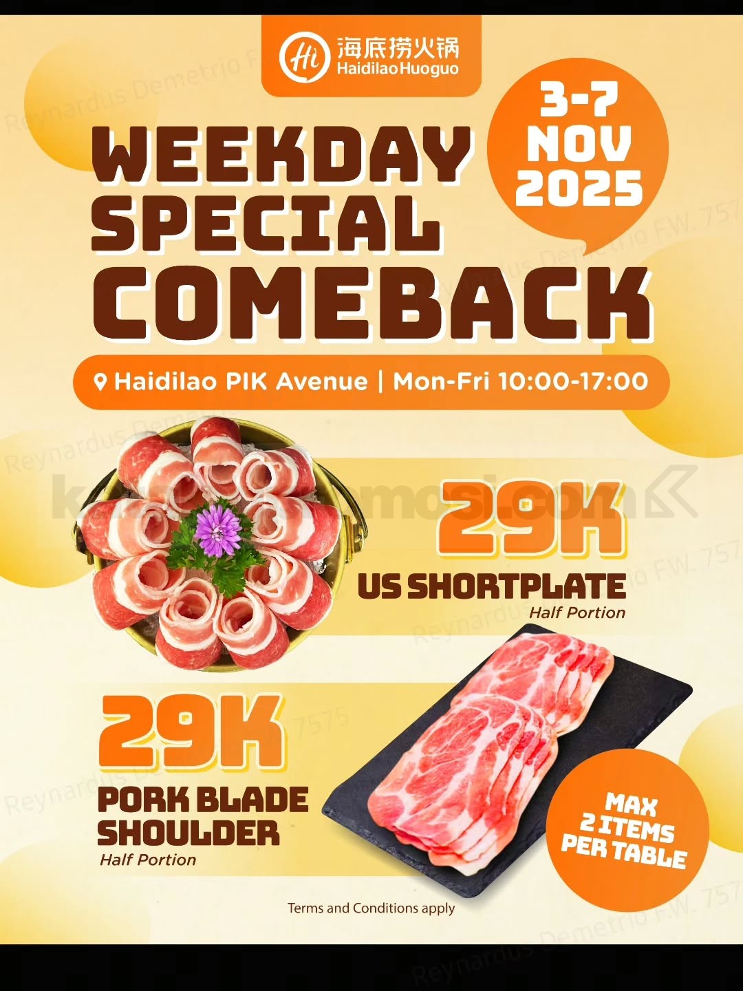 Jangan lewatkan kesempatan spesial dari Promo Haidilao Weekday Special Comeback! ๐ฅ Langsung ajak teman, pasangan, atau keluarga buat nikmatin US Shortplate & Pork Blade cuma 29K di Haidilao PIK Avenue!