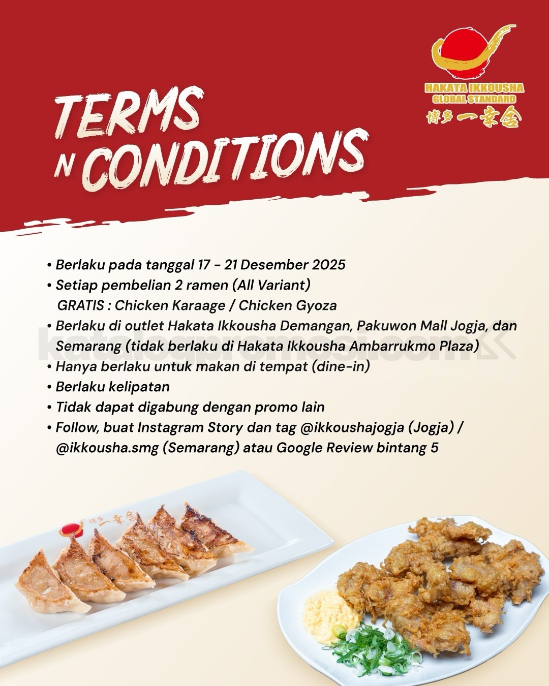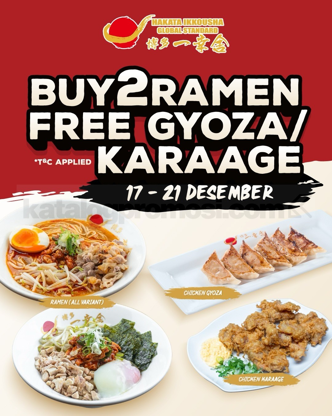 Promo Hakata Ikkousha Buy 2 Ramen Free Chicken Gyoza, beli 2 ramen semua varian gratis side dish favorit, berlaku mulai tanggal 17 Desember 2025 – 21 Desember 2025 di lokasi tertentu.