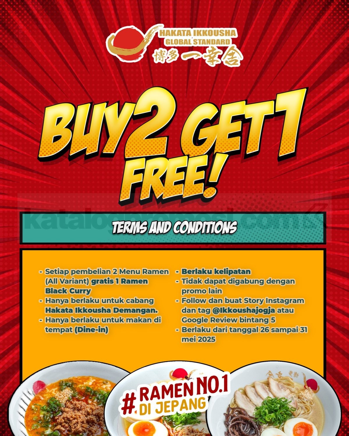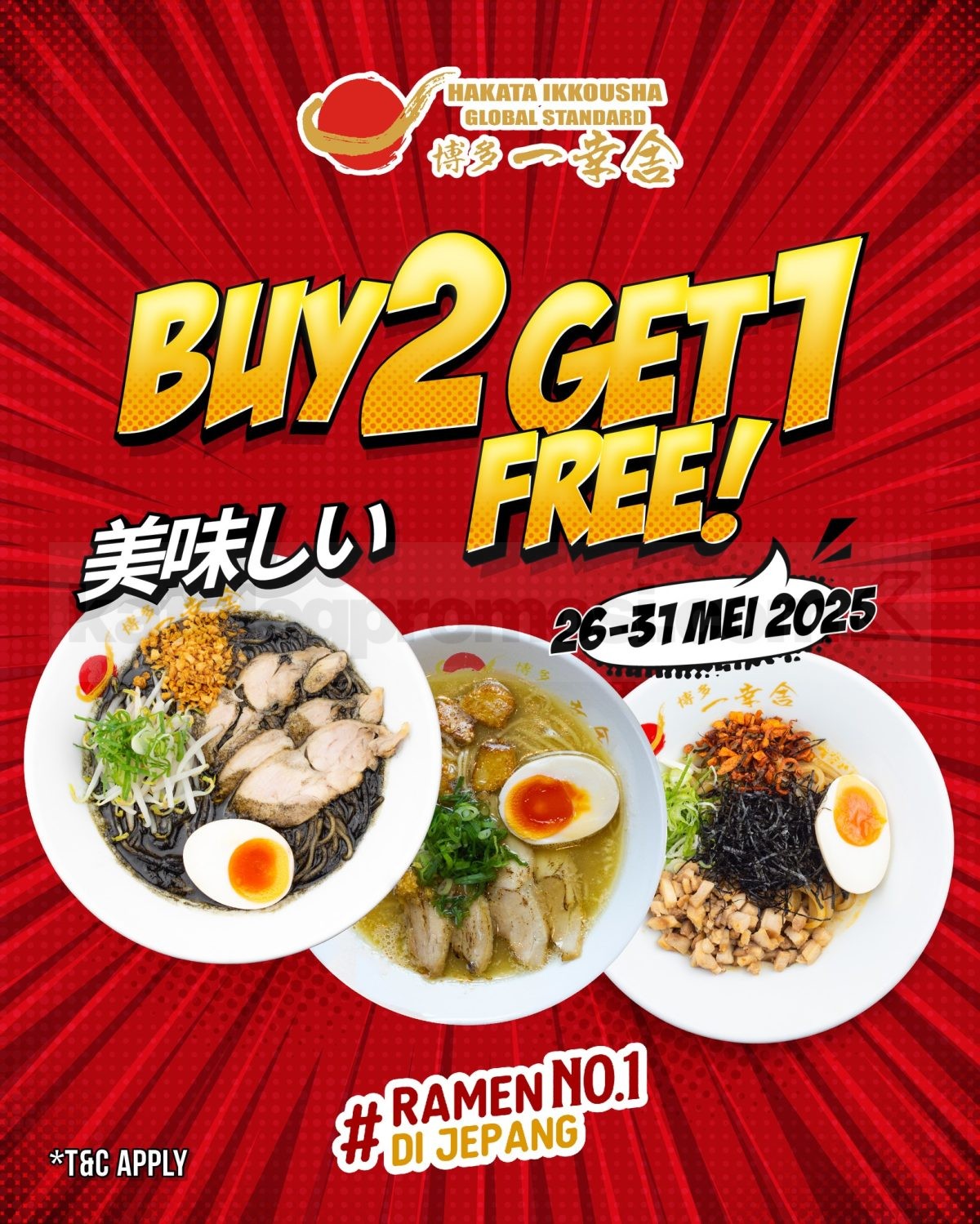 Promo Hakata Ikkousha Menu Ramen Diskon 50% untuk pembelian ramen kedua dengan syarat beli minuman, berlaku 24โ30 November 2025 di dua lokasi Jogja.