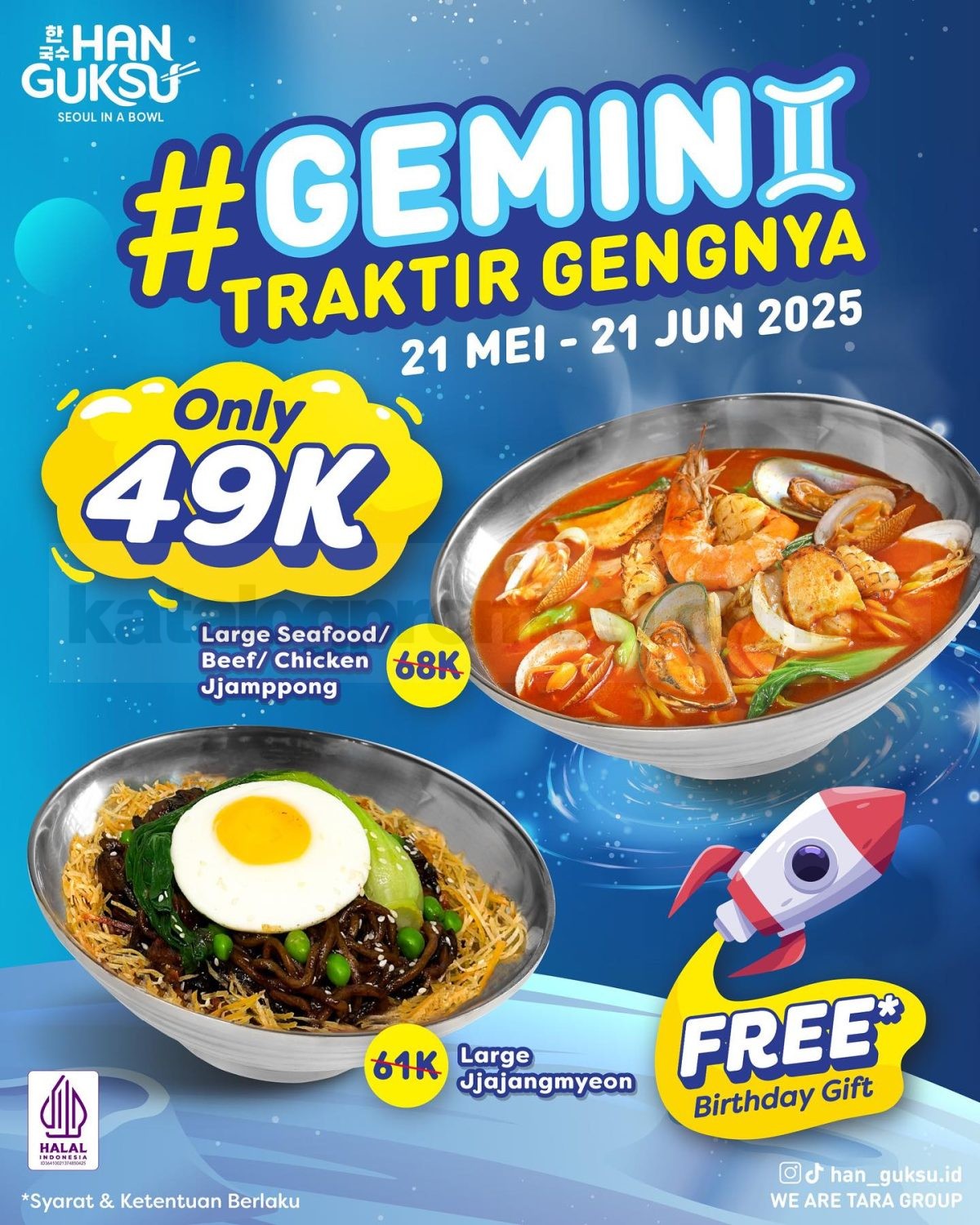 Promo HAN GUKSU Sagitarius Treat memberikan paket makan berdua seharga Rp. 99.000 untuk pelanggan berzodiak Sagitarius. Promo ini berlangsung dari 20 November sampai 21 Desember 2025 dan berlaku setiap hari untuk dine-in. Paketnya berisi dua menu utama, yaitu Large Seafood Jjamppong dan Jjajangmyeon, dan tersedia di seluruh outlet HAN GUKSU.