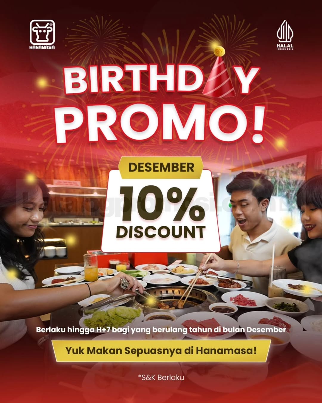 Promo Hanamasa Birthday Treats Diskon 10% untuk pelanggan yang ulang tahun di bulan tersebut.