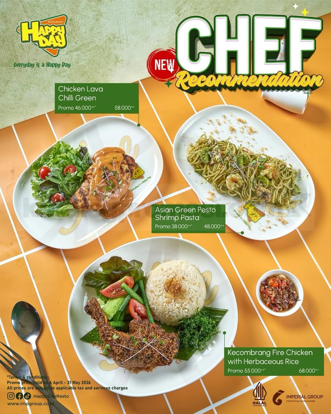 Promo Happy Day Chef Recommendation mulai Rp. 38.000 pilihan menu spesial chef, berlaku mulai tanggal 6 April 2025 – 31 Mei 2026 di outlet tertentu.