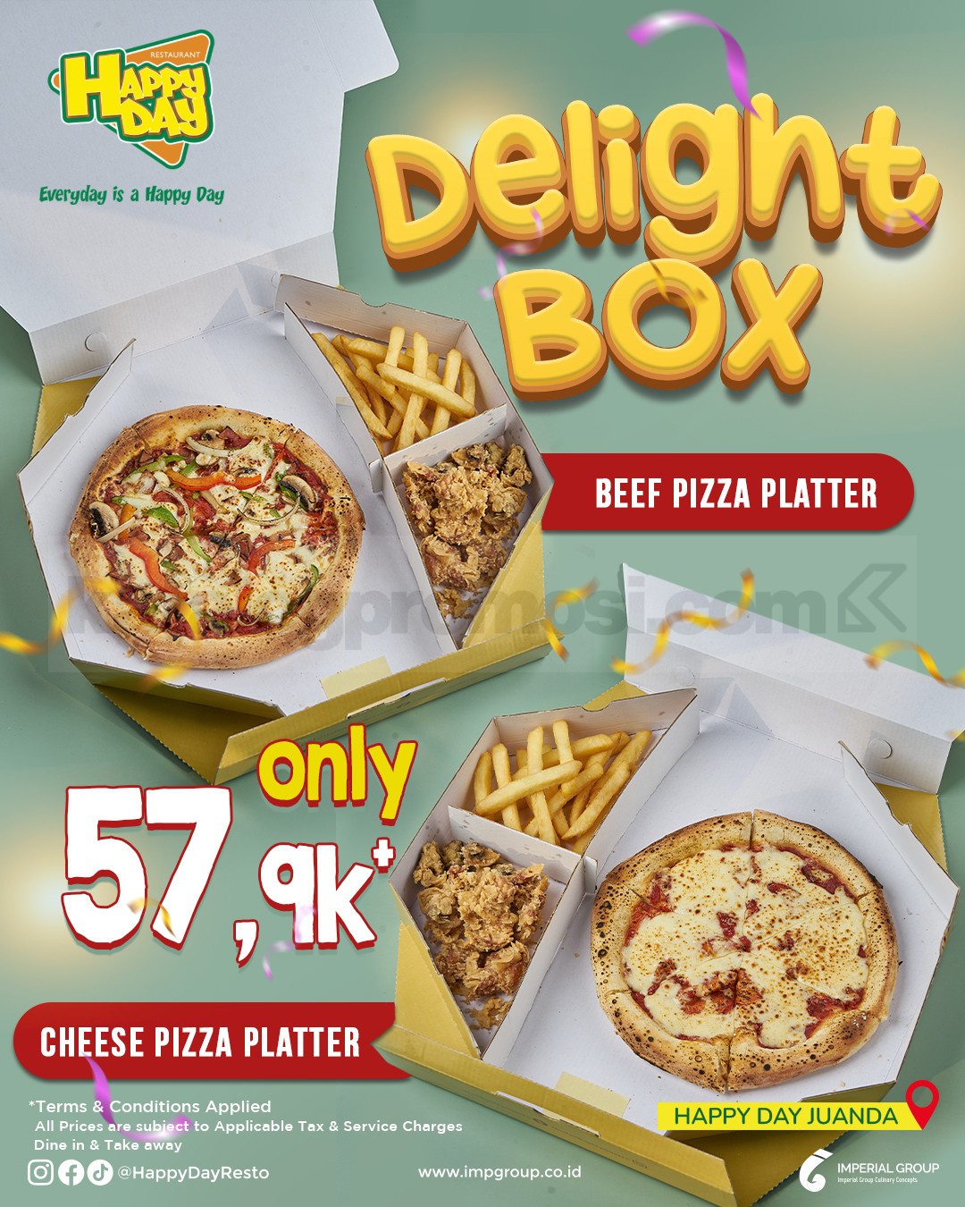 Lagi buru-buru tapi pengen makan pizza enak? Sekarang kamu bisa bawa pulang pizza favorit dari Happy Day Juanda lewat Delight Box — cuma Rp57.900+ aja (belum termasuk pajak)!