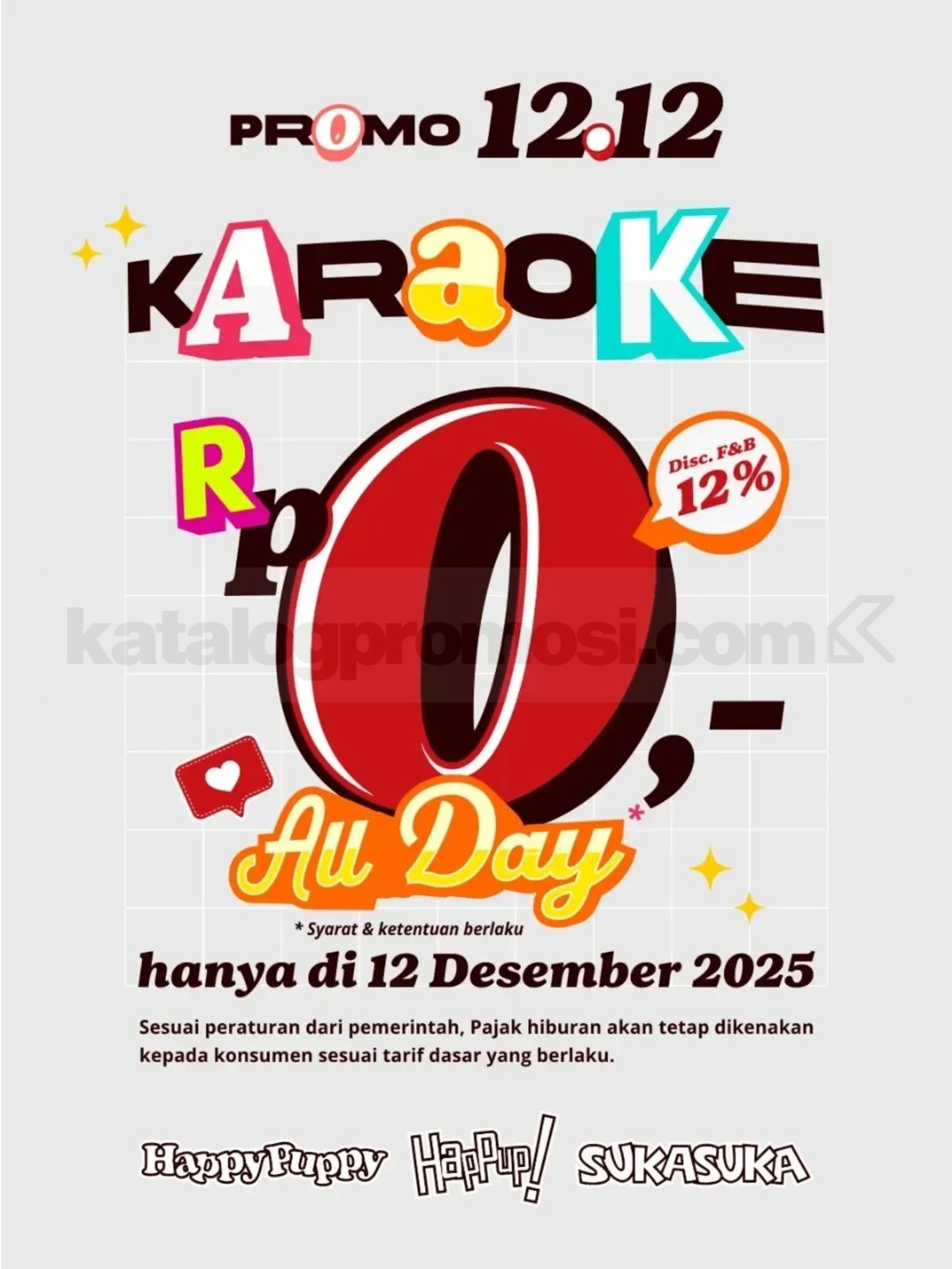 Promo Happy Puppy 12.12 Karaoke Gratis 1 Jam berlaku 12 Desember 2025 dengan minimal pembelian 1 makanan atau minuman plus diskon F&B 12%.