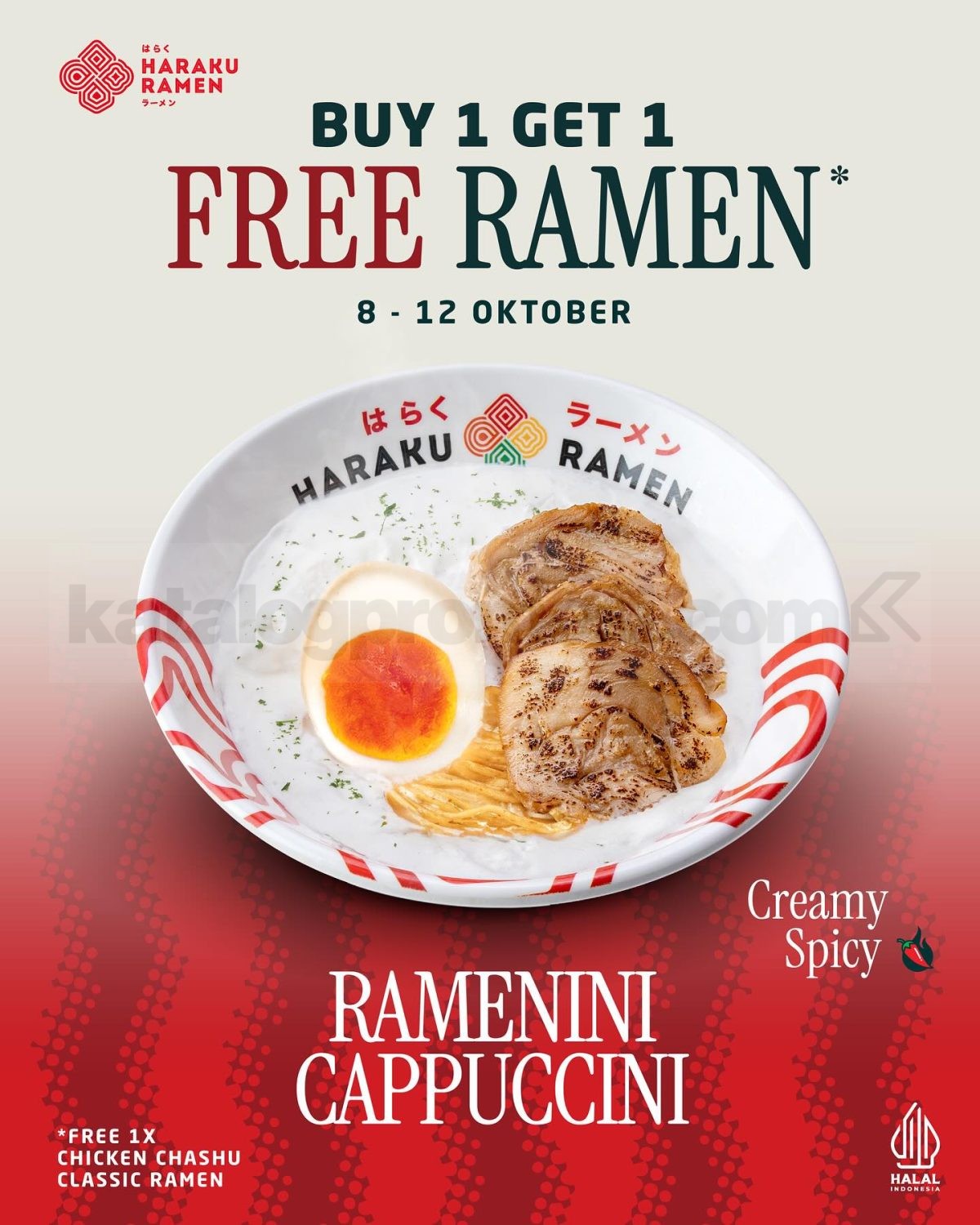 Promo HARAKU RAMEN 10.10 Buy 1 Get 1 Free berlaku 8–12 Oktober 2025 di seluruh outlet Haraku Ramen kecuali 23 Paskal, beli Ramenini Cappuccini gratis Chicken Chashu Classic Ramen.