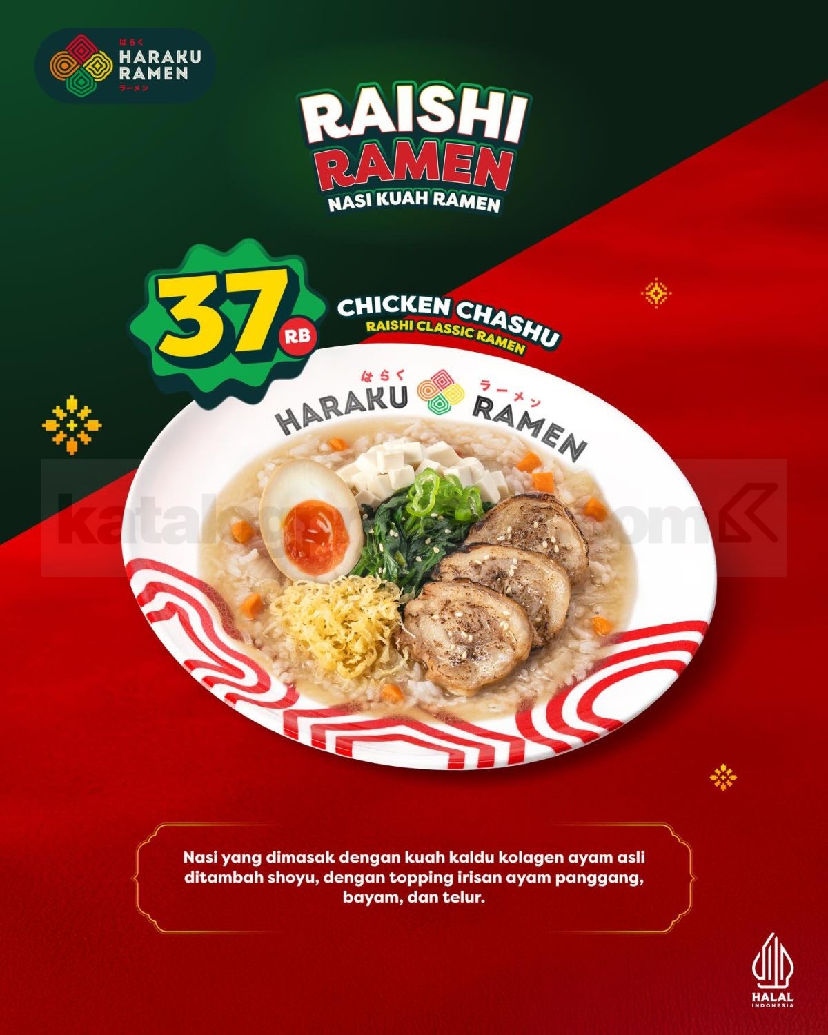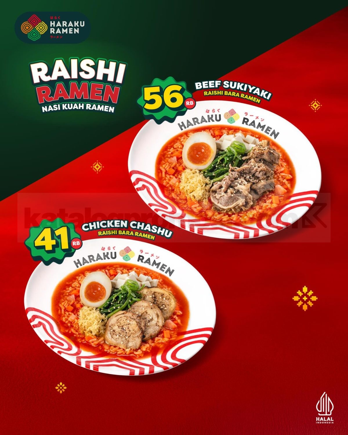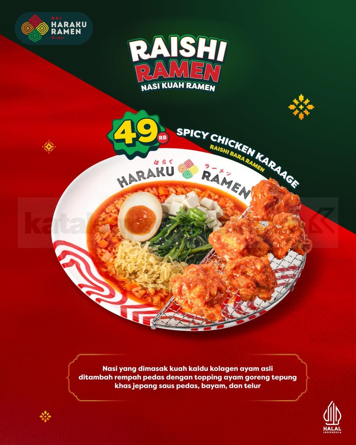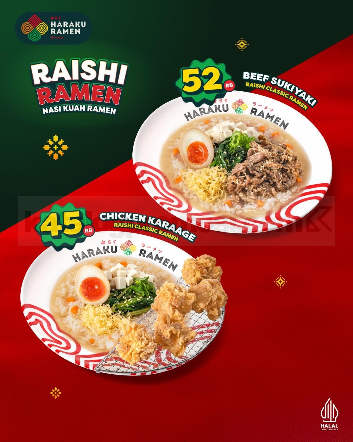 Promo Haraku Ramen NEW! Raishi Ramen mulai Rp. 37.000 jadi pilihan spesial untuk kamu yang cari menu berbuka yang hangat, gurih, dan bikin nyaman. Raishi Ramen adalah nasi kuah ramen yang dimasak langsung dengan kuah kaldu kolagen ayam asli, menghasilkan rasa yang lebih kaya, lembut, dan comforting di setiap suapan.