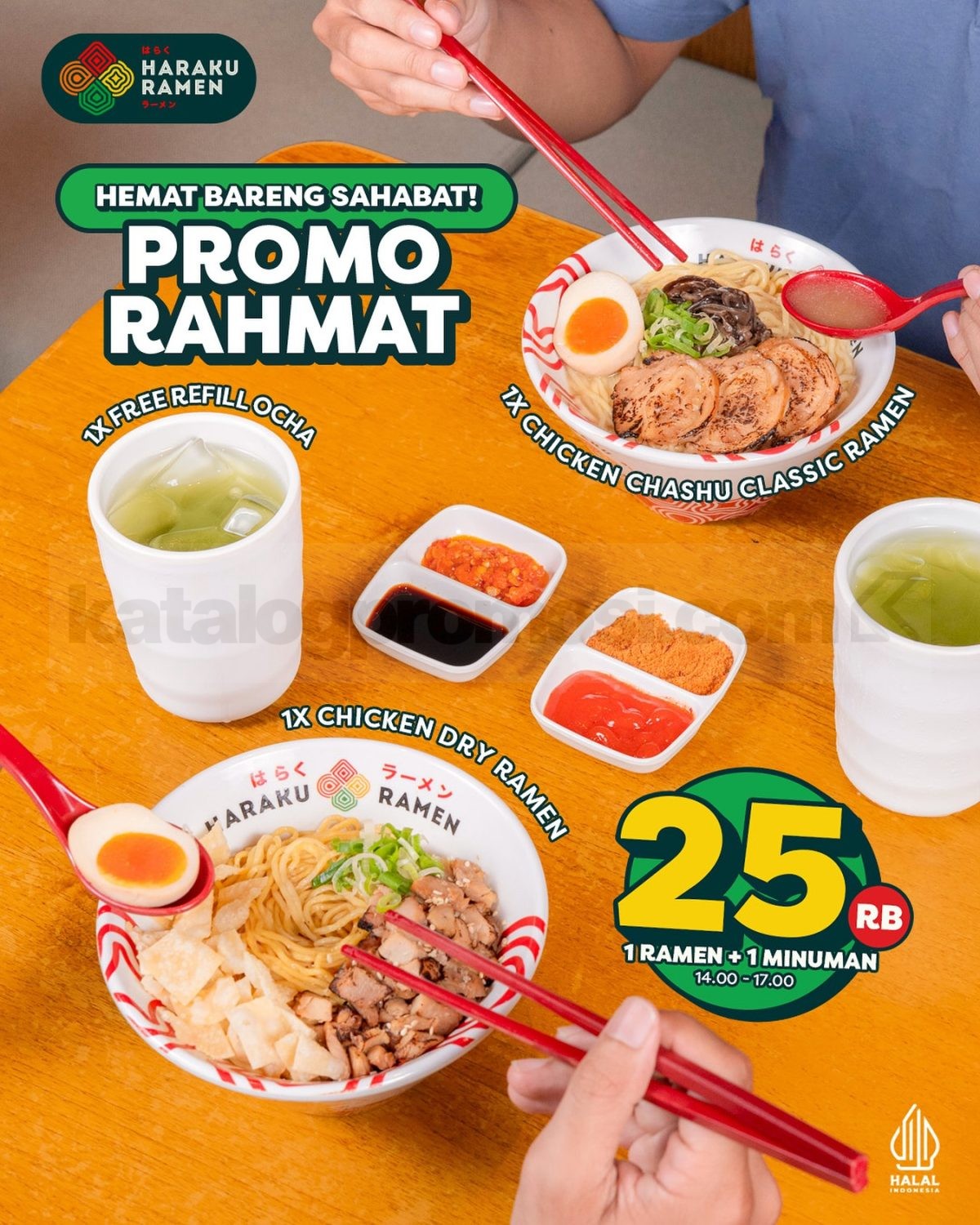 Promo Haraku Ramen Paket Rahmat cuma Rp25.000 dapat Chicken Chashu Classic Ramen dan Ocha refill, berlaku jam 14.00โ17.00 WIB.