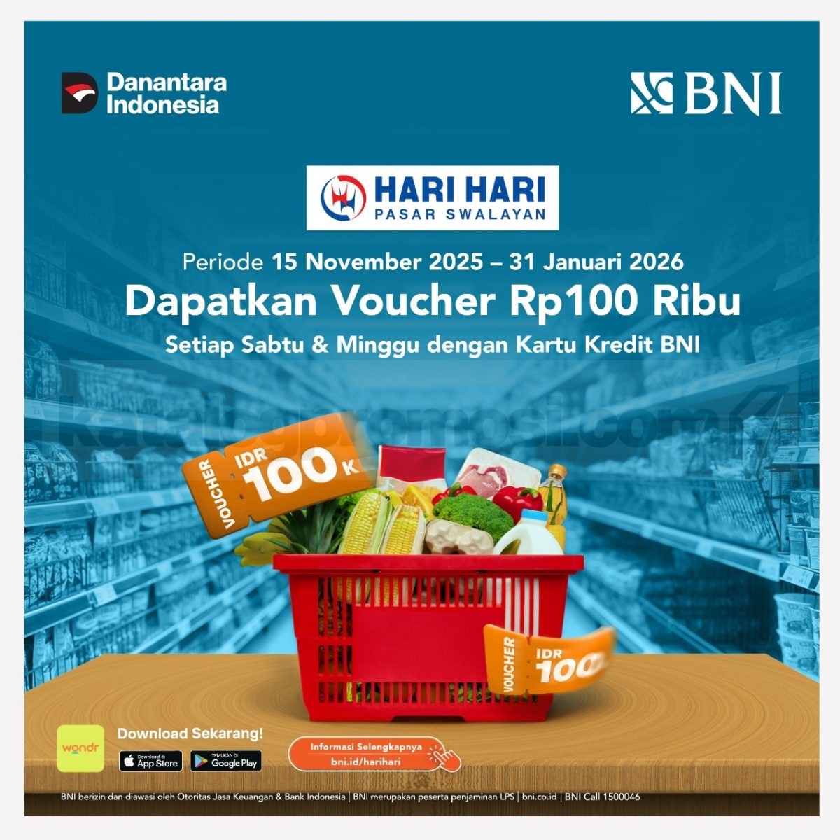 Promo Hari-Hari Swalayan BNI gratis voucher Rp50 ribu untuk transaksi Rp1 juta, berlaku mulai tanggal 5 September 2025 – 31 Januari 2026 di seluruh outlet.