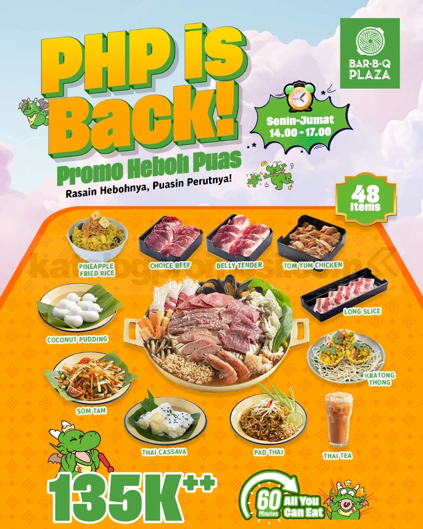 Promo ini pas banget buat yang kangen vibes makan ramai-ramai setelah liburan. Dengan harga hemat Rp135.000++, kamu bisa cobain berbagai menu favorit tanpa batas. Atur waktumu, ajak orang terdekat, dan nikmatin momen makan seru di Bar.B.Q Plaza.