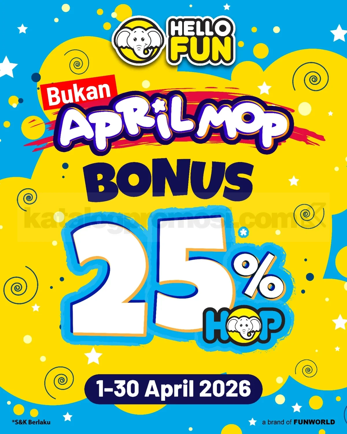 Promo Hello Fun Bukan April Mop Bonus 25% HOP tambahan saldo Hello Card dengan follow Instagram berlaku mulai tanggal 1 April – 30 April 2026 di lokasi tertentu.