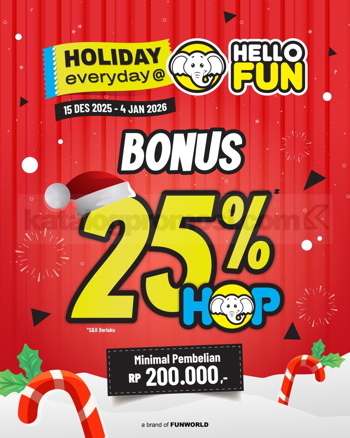 Promo Hello Fun Liburan Akhir Tahun Bonus 25% HOP bikin liburan makin fun dengan bonus HOP langsung ke Hello Card, berlaku mulai tanggal 15 Desember 2025 – 4 Januari 2026 di seluruh outlet Funworld.