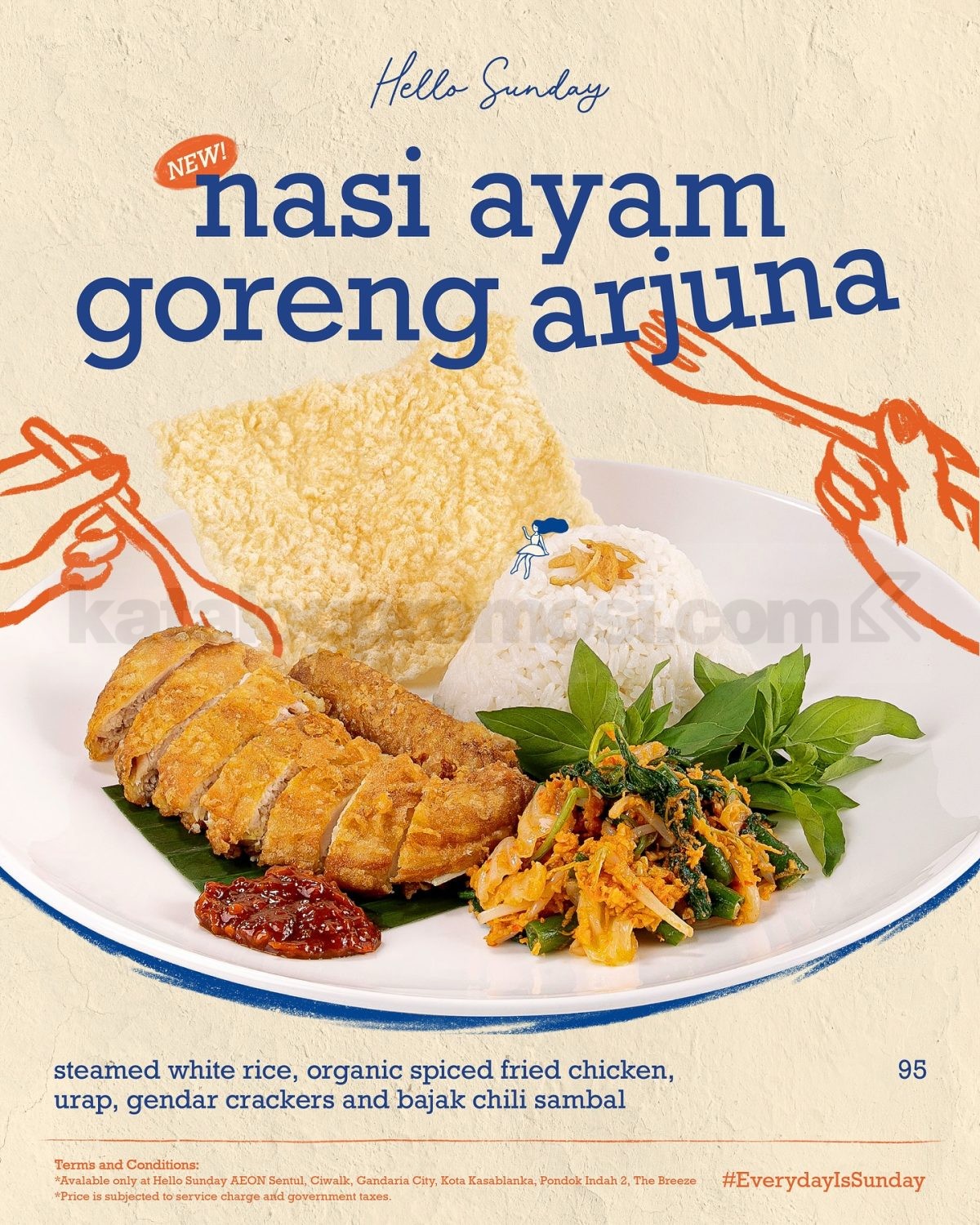 Promo Hello Sunday NEW! Nasi Ayam Goreng Arjuna hadir buat kamu yang kangen makanan nusantara dengan cita rasa khas. Menu ini berisi nasi putih hangat, organic spiced fried chicken yang renyah, urap sayur segar, gendar crackers, dan sambal bajak pedas gurih.