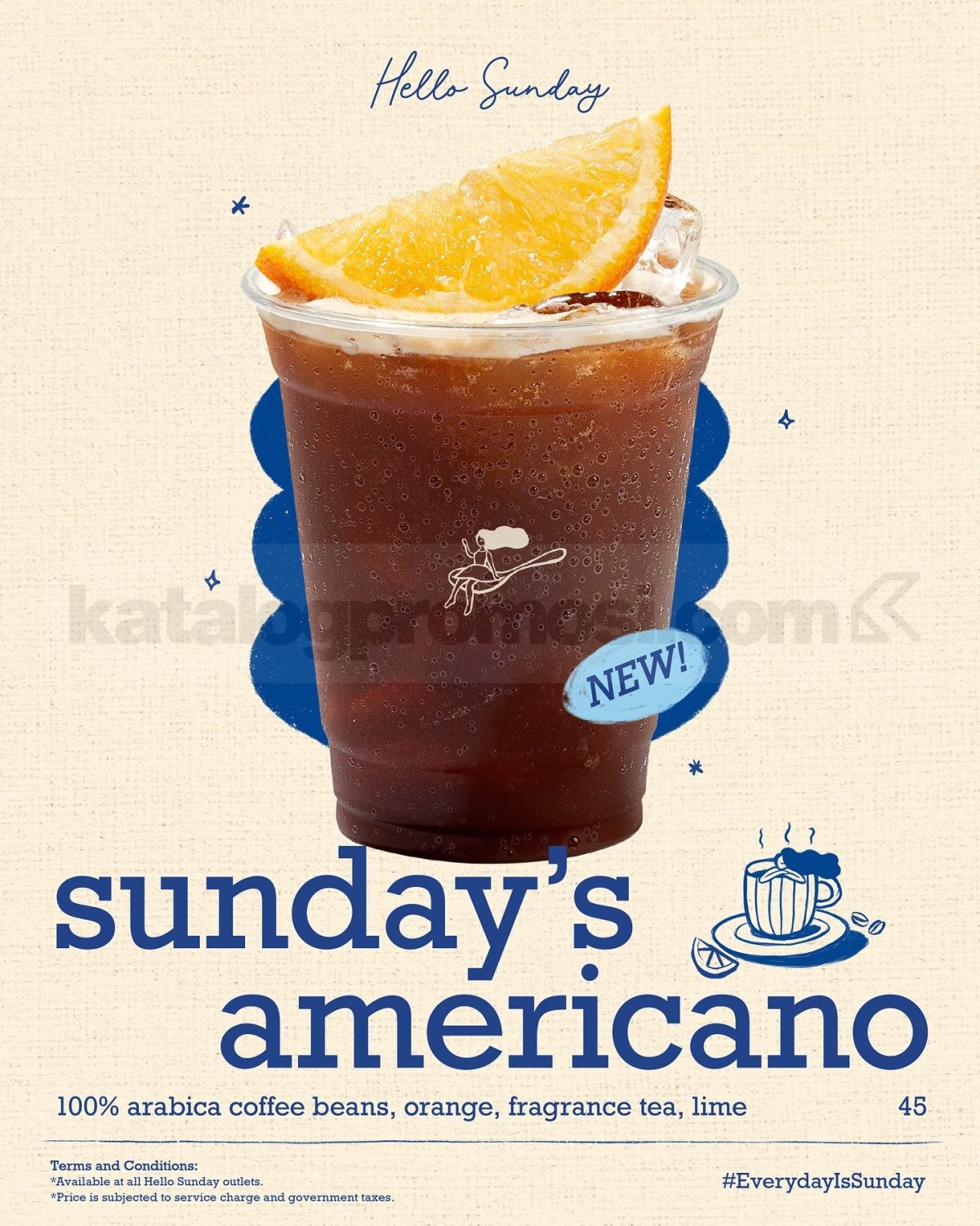 Pesan Sunday’s Americano seharga Rp45.000 di seluruh outlet Hello Sunday, harga belum termasuk service charge dan pajak pemerintah