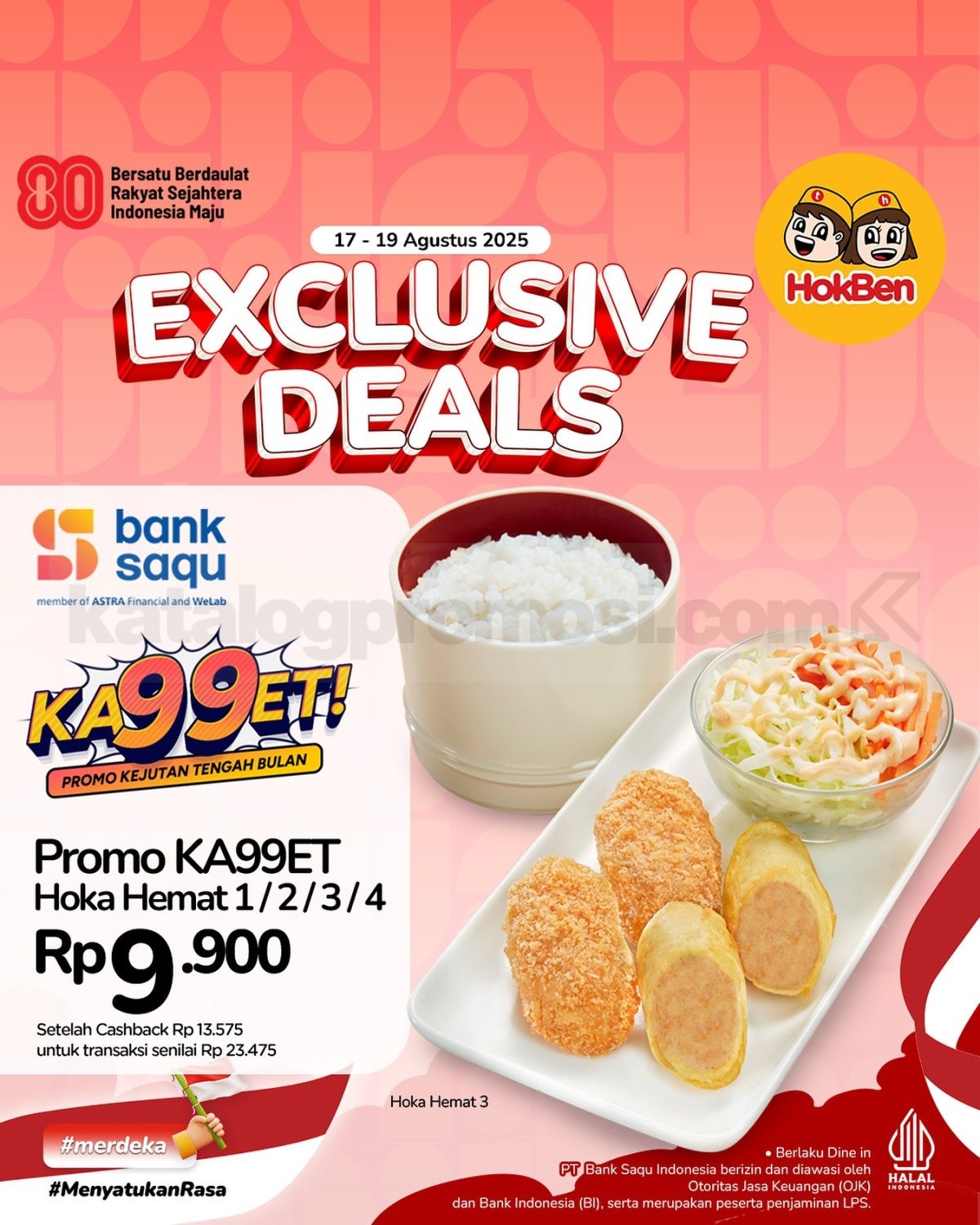 Promo HokBen Bank Saqu Merdeka Hoka Hemat cuma Rp9.900 berlaku 17–19 Agustus 2025 khusus dine in dengan pembayaran QRIS Bank Saqu di outlet HokBen.