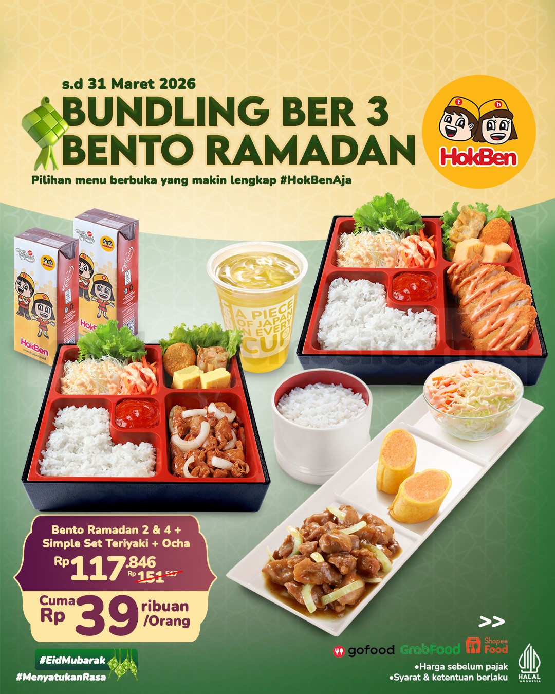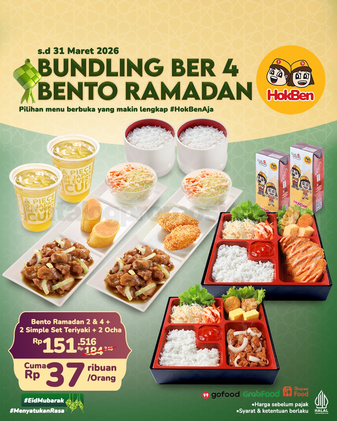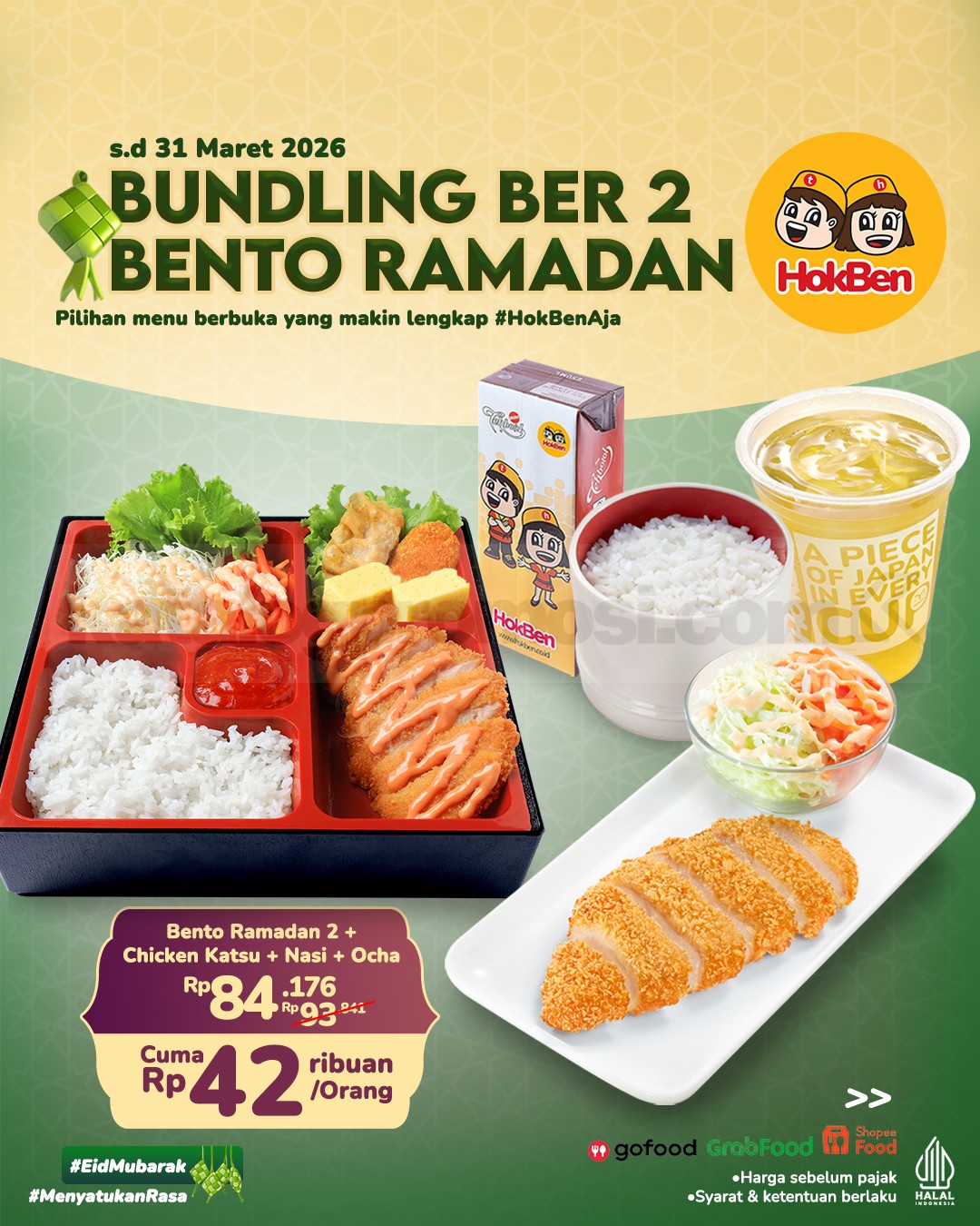 Promo HokBen Bundling Bento Ramadan mulai Rp. 37 ribu/orang dengan paket berdua hingga berempat, berlaku sampai tanggal 31 Maret 2026 di seluruh outlet.