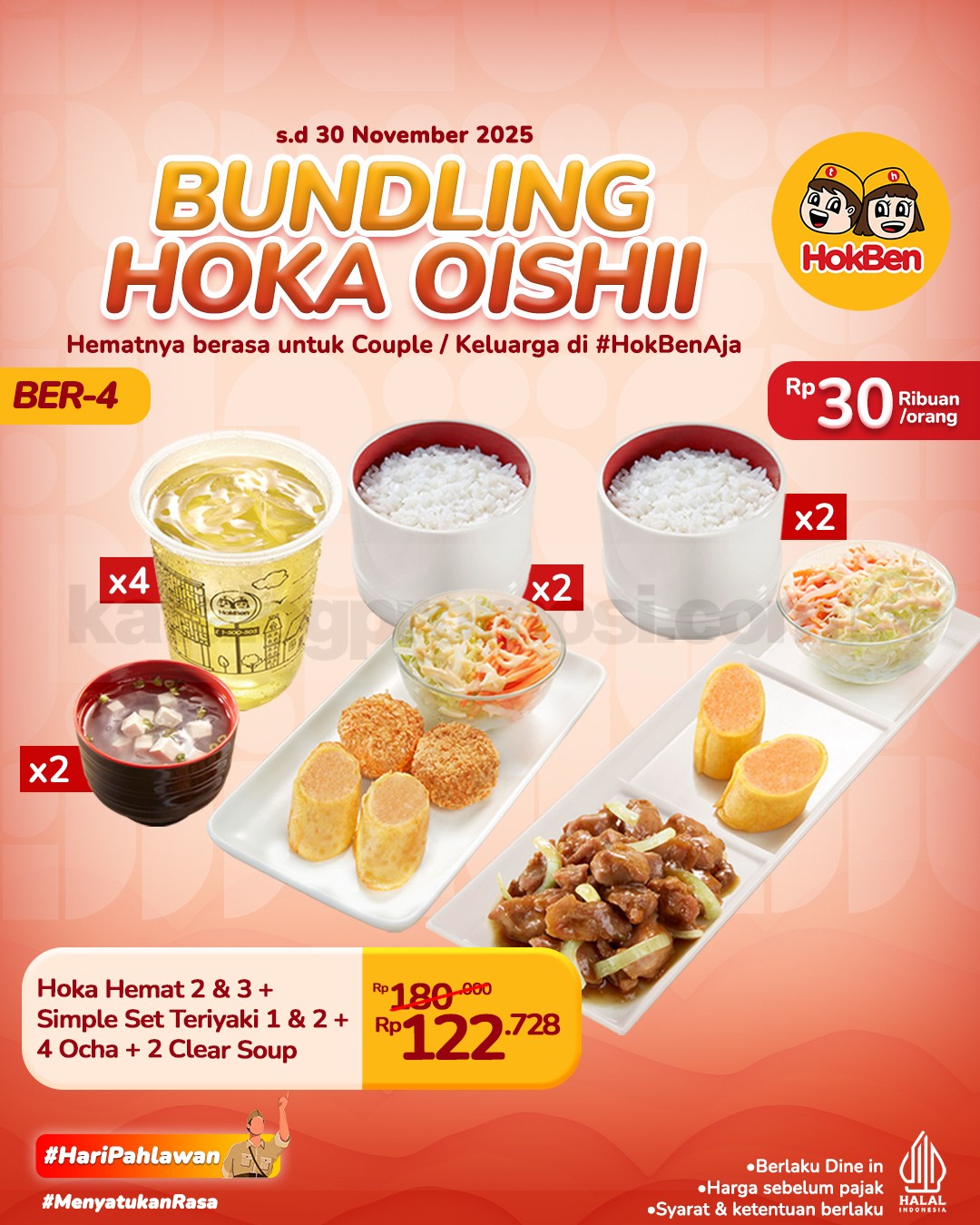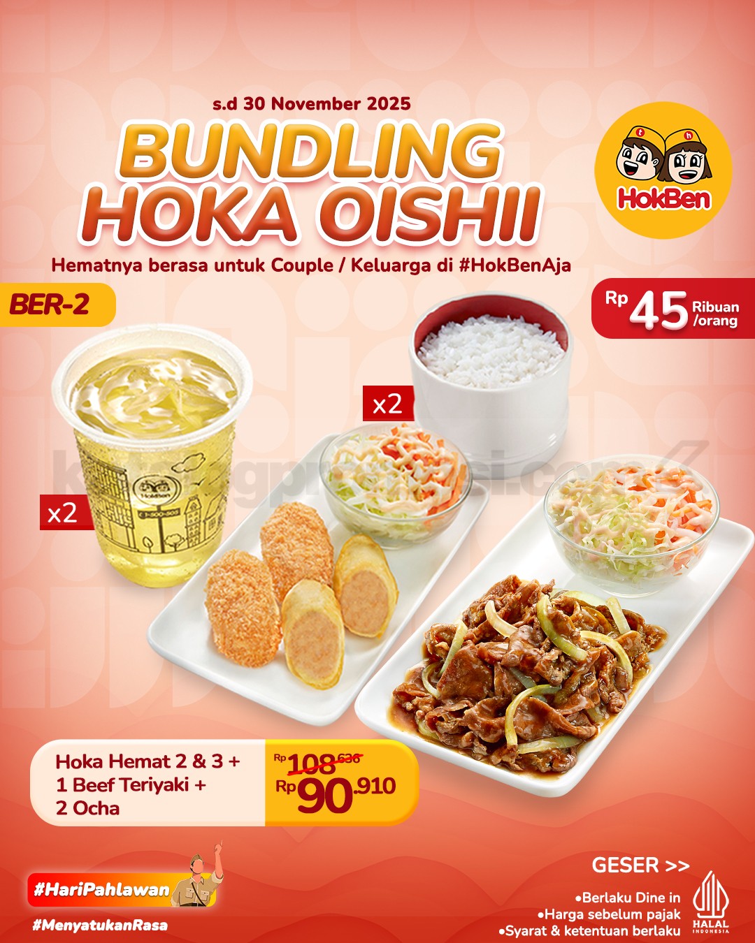 Promo HokBen Bundling Hoka Oishii mulai Rp. 90.910 dengan pilihan paket untuk 2–4 orang, berlaku sampai 30 November 2025 untuk dine in, take away, drive thru, dan delivery.