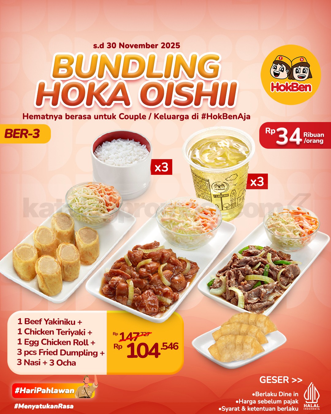 Kamu bisa menikmati paket bundling dengan pilihan lengkap yang sudah termasuk makanan favorit HokBen sampai minuman Ocha. Untuk pilihan Ber2, paketnya diisi Hoka Hemat 2 & 3 ditambah 1 Beef Teriyaki dan 2 Ocha dengan harga Rp 90.910. Kalau mau tambah ramai, ada paket Ber3 berisi Beef Yakiniku, Chicken Teriyaki, Egg Chicken Roll, 3 pcs Fried Dumpling, 3 nasi, dan 3 Ocha dengan harga Rp 104.546.